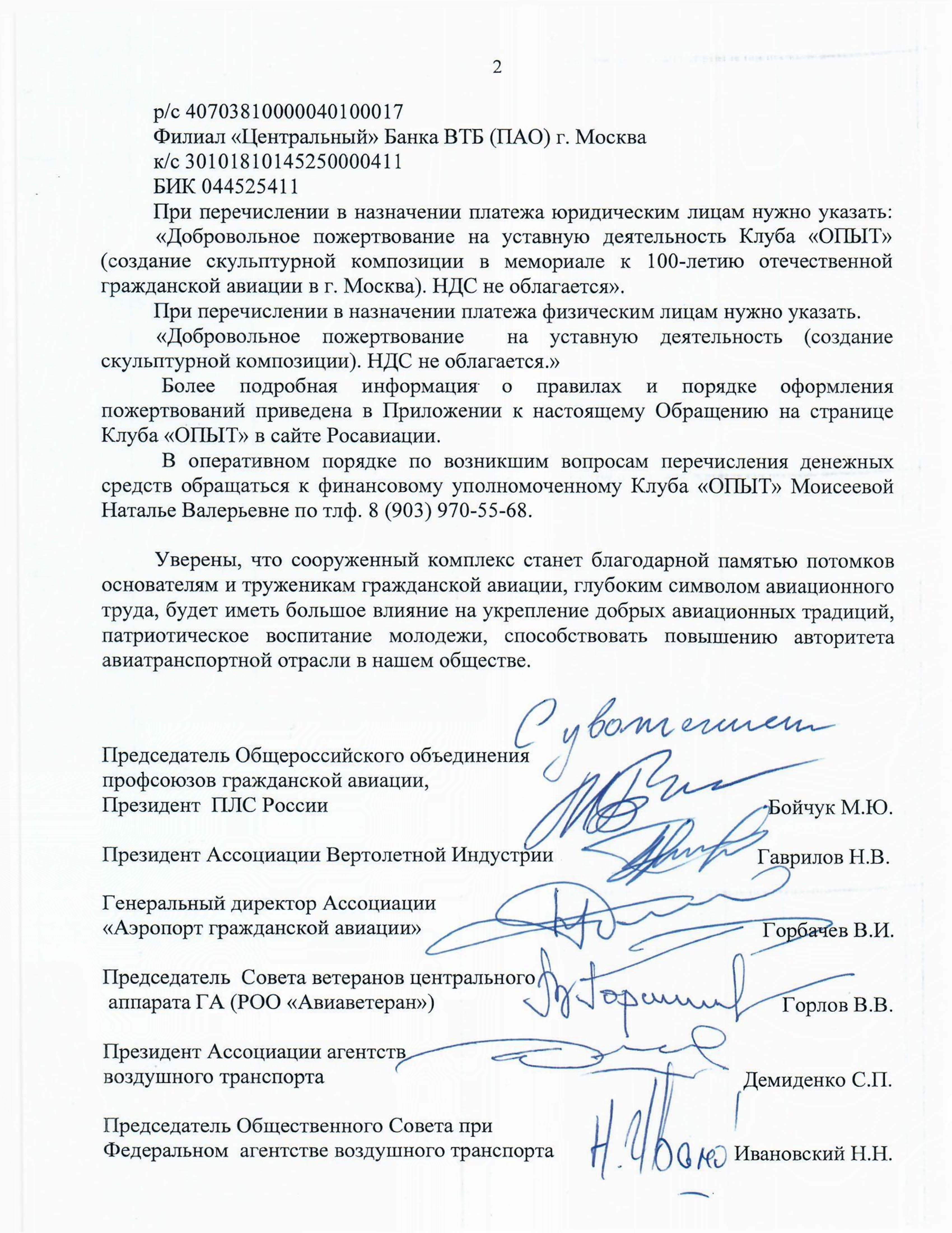 Обращение руководителей общественных и ветеранских организаций ГА России по вопросу сооружения памятника «100 лет отечественной гражданской авиации»