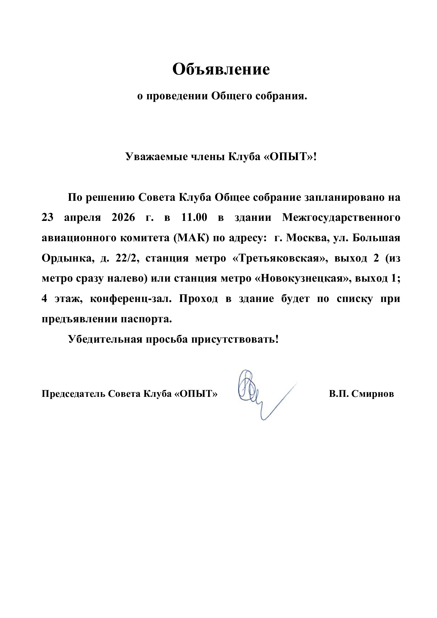 Объявление о проведении Общего собрания