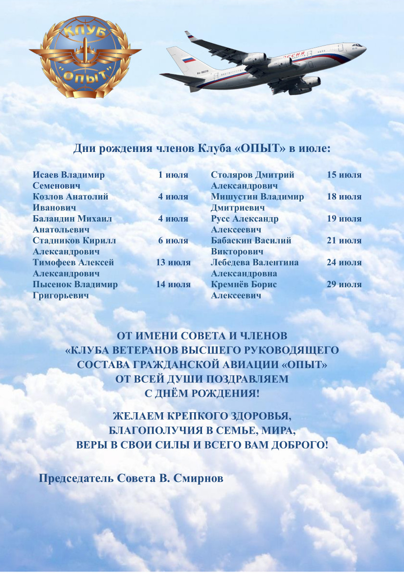 Дни рождения членов Клуба «ОПЫТ» в июле
