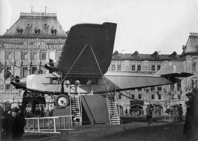 | Фото 1923 г. Недавно открыта первая регулярная авиалиния Москва-Нижний Новгород. Для популяризации воздушного сообщения в центре Москвы на обозрение публики выставлен в центре столицы самолет АНТ-9 (ПС-9). |