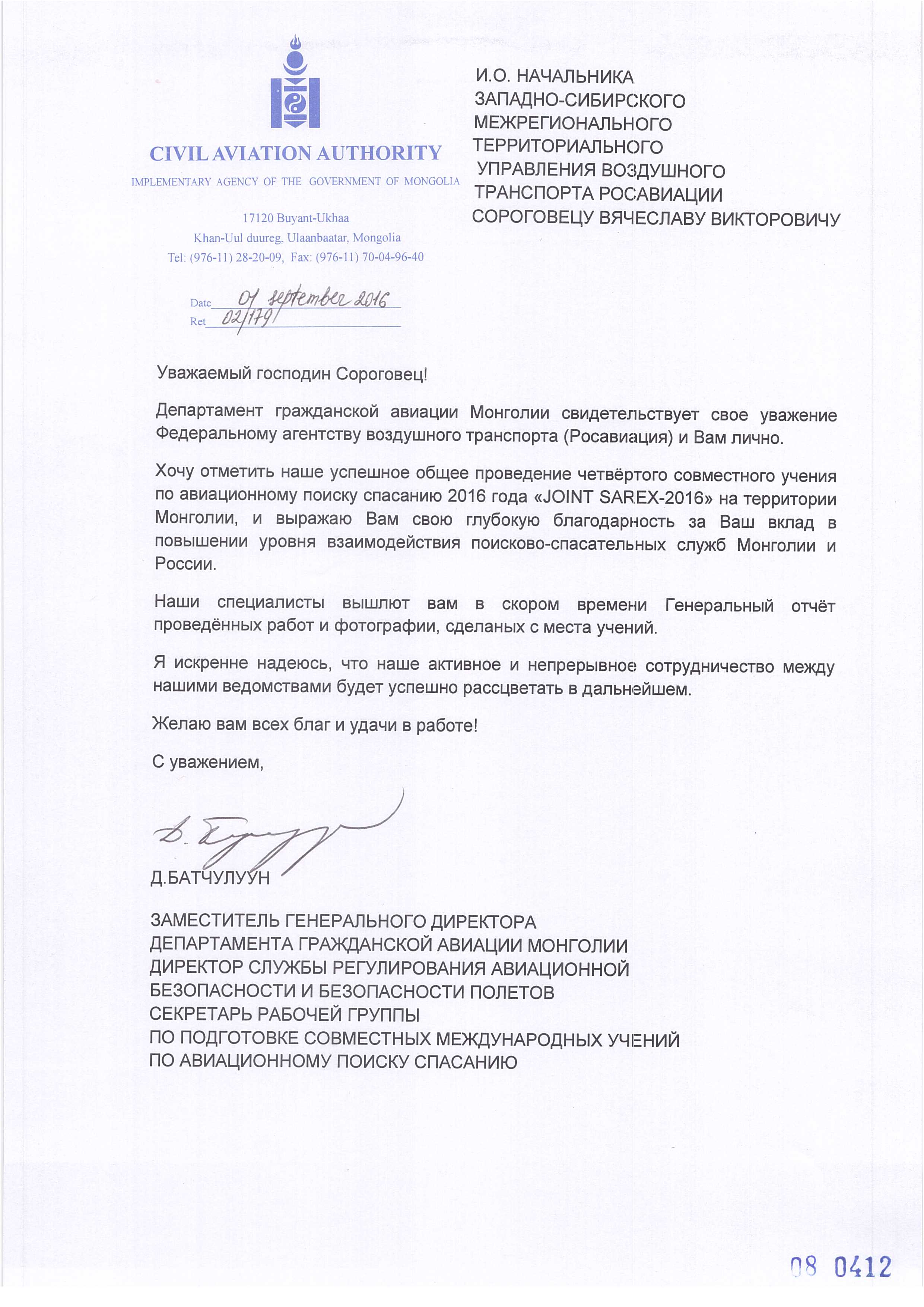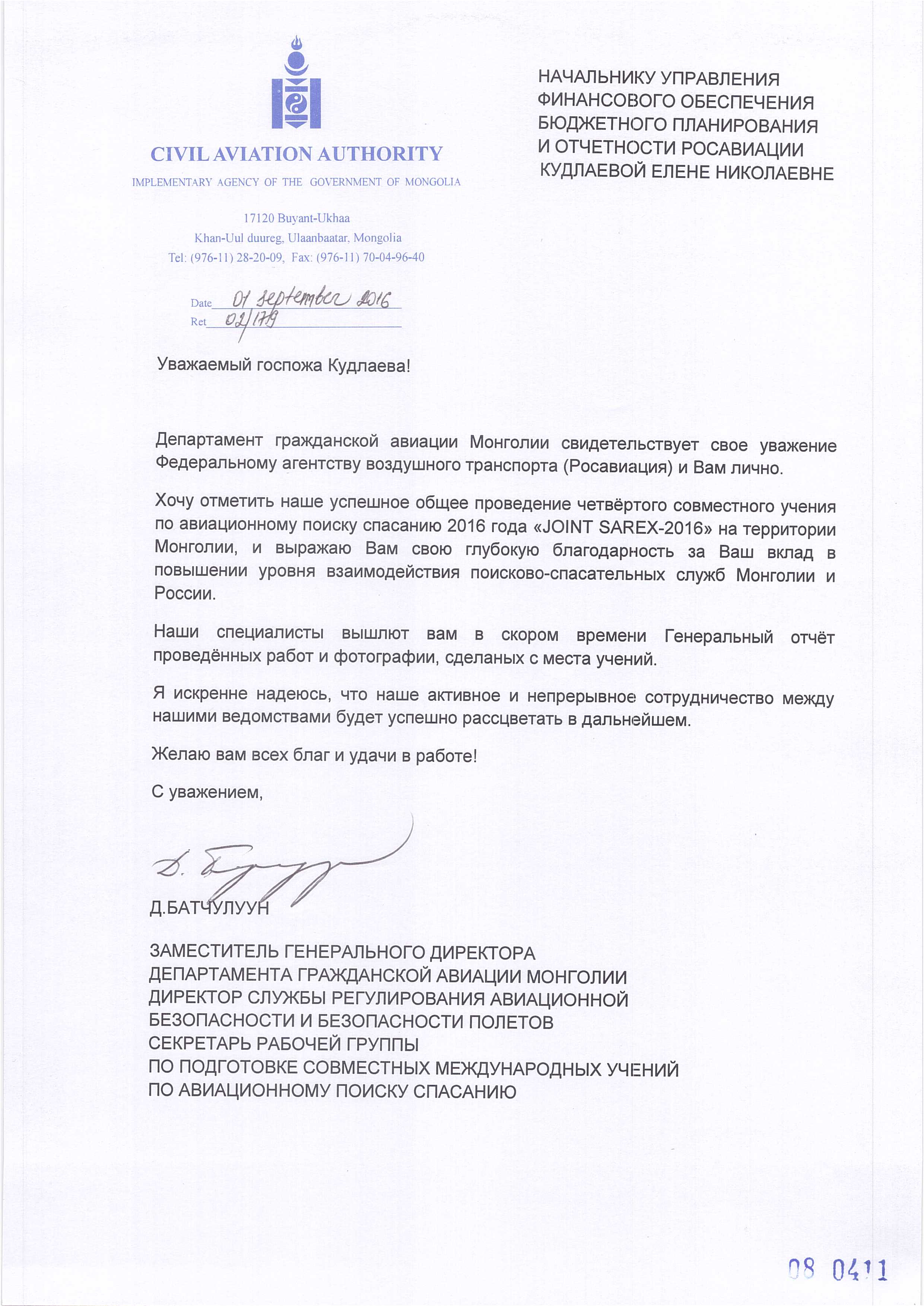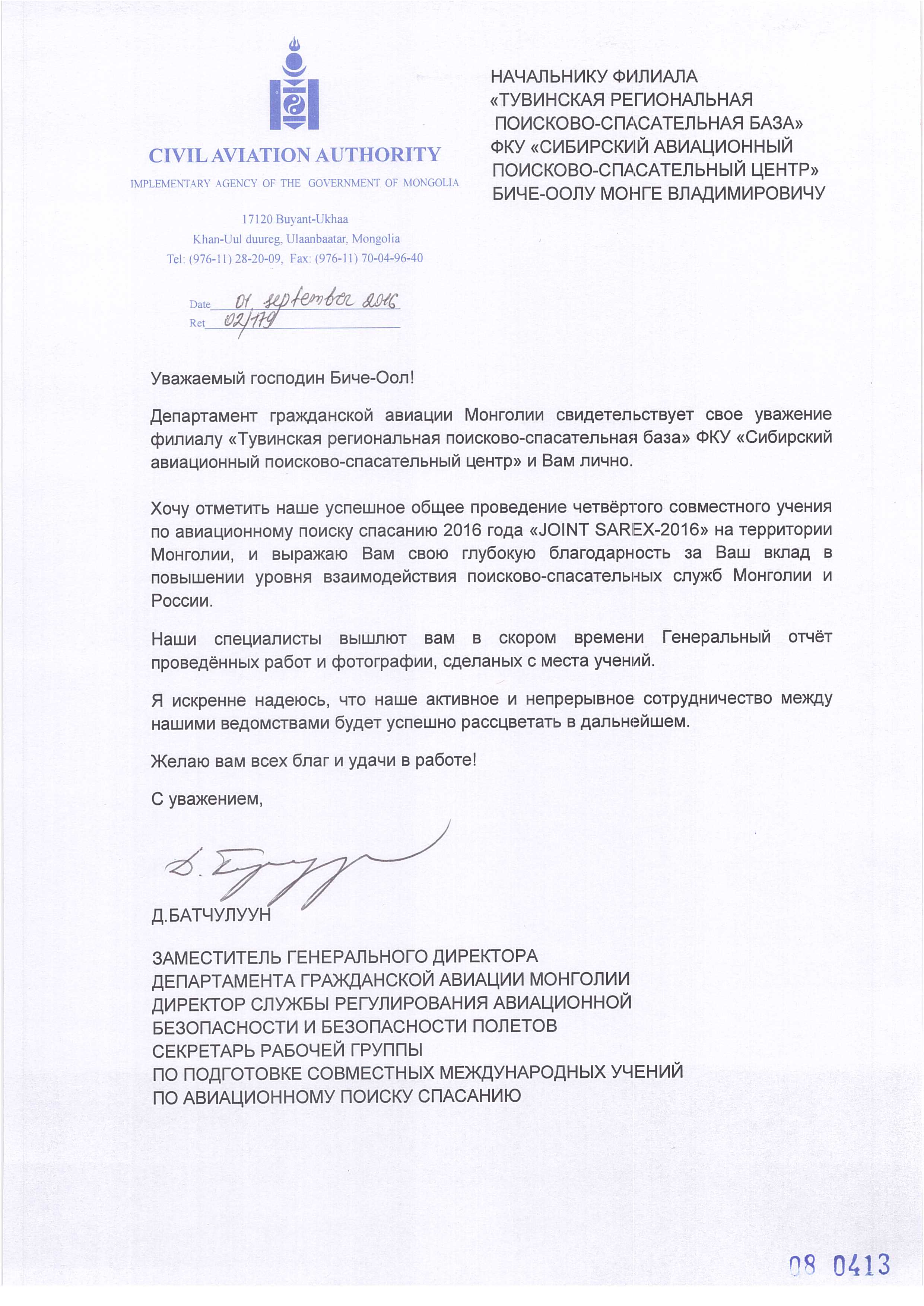 Департамент гражданской авиации Монголии выразил российской стороне благодарность за вклад в повышение уровня взаимодействия поисково-спасательных служб Монголии и России и успешное проведение четвёртого совместного учения по авиационному поиску спасанию 2016 года «JOINT SAREX-2016»