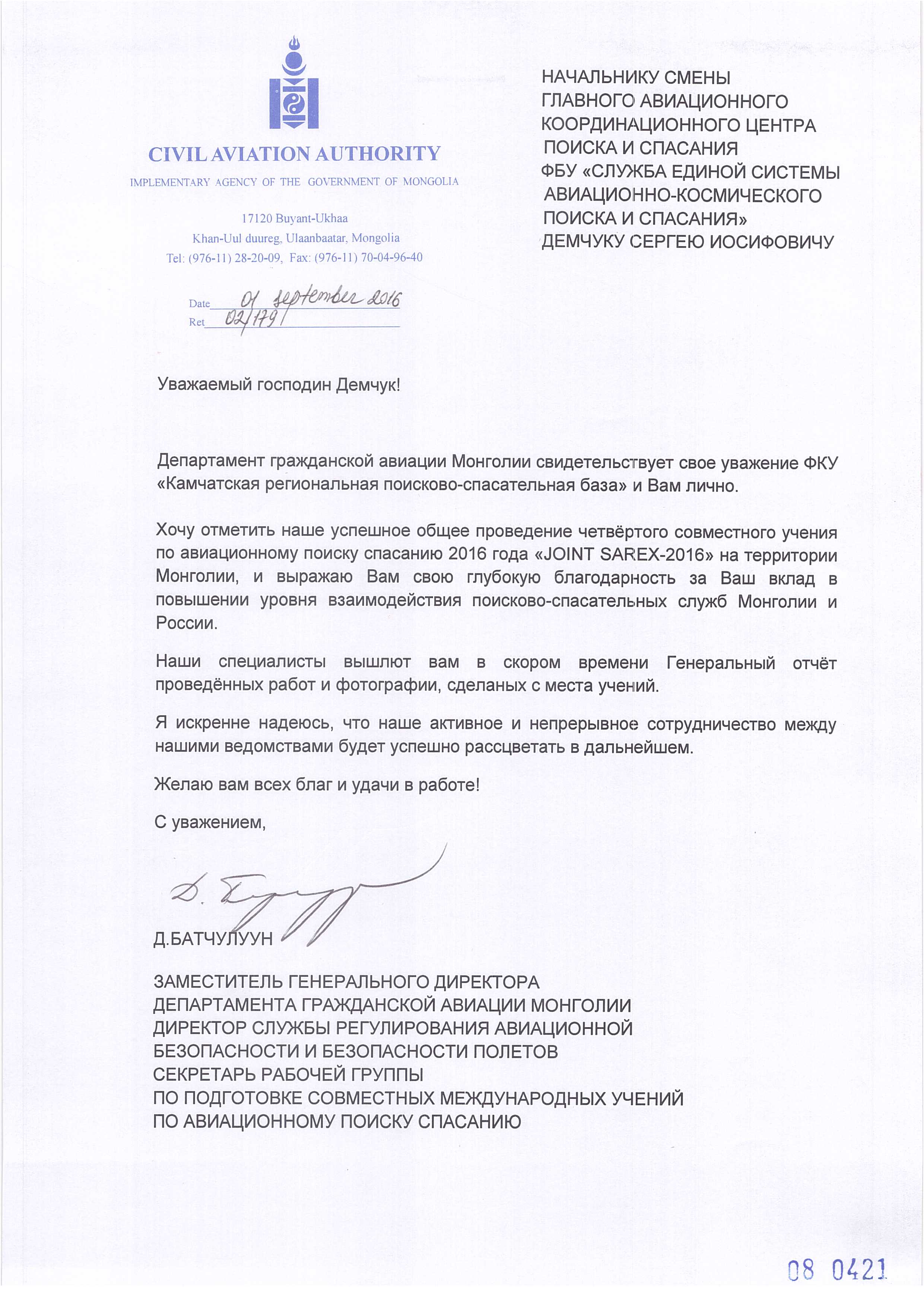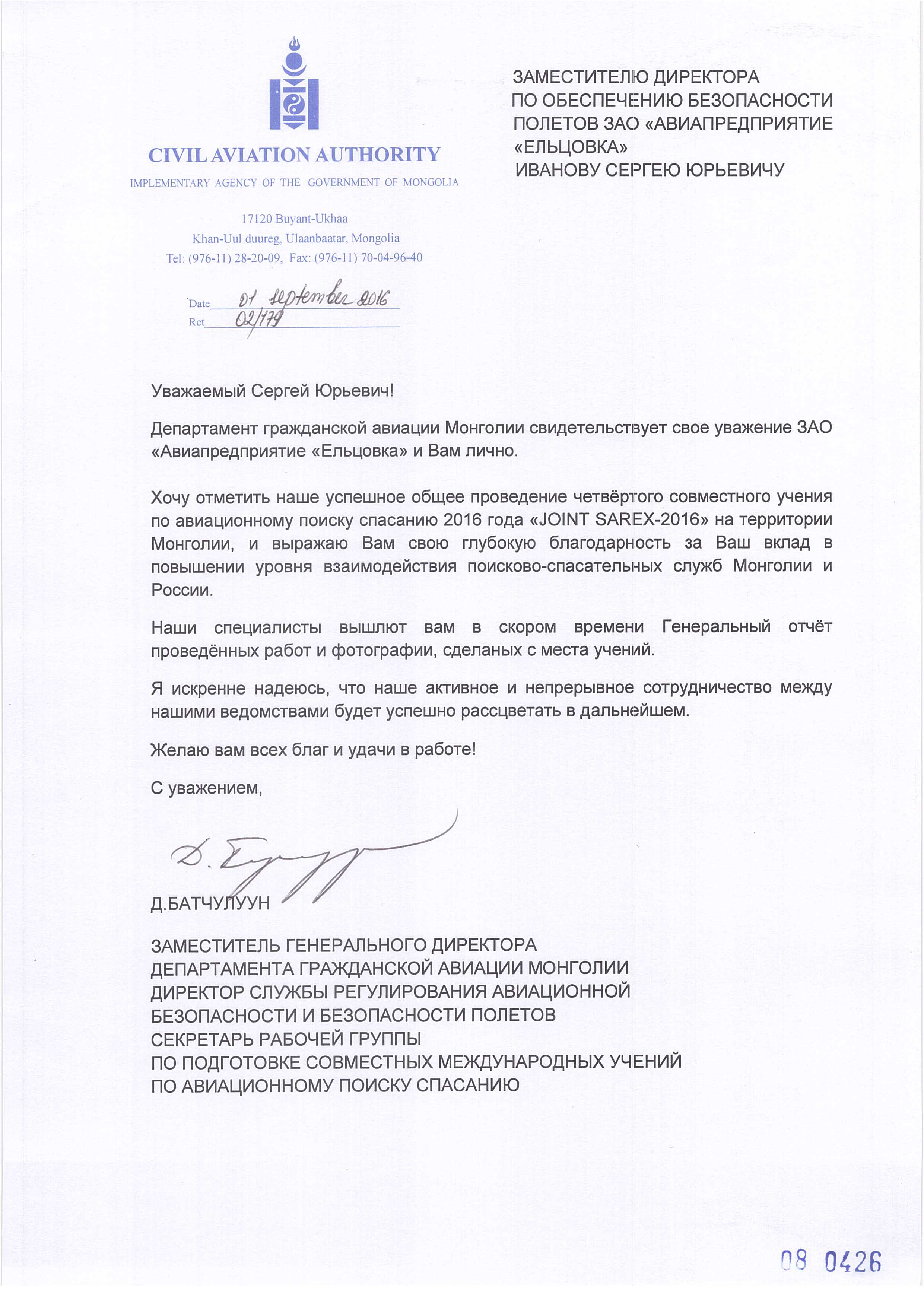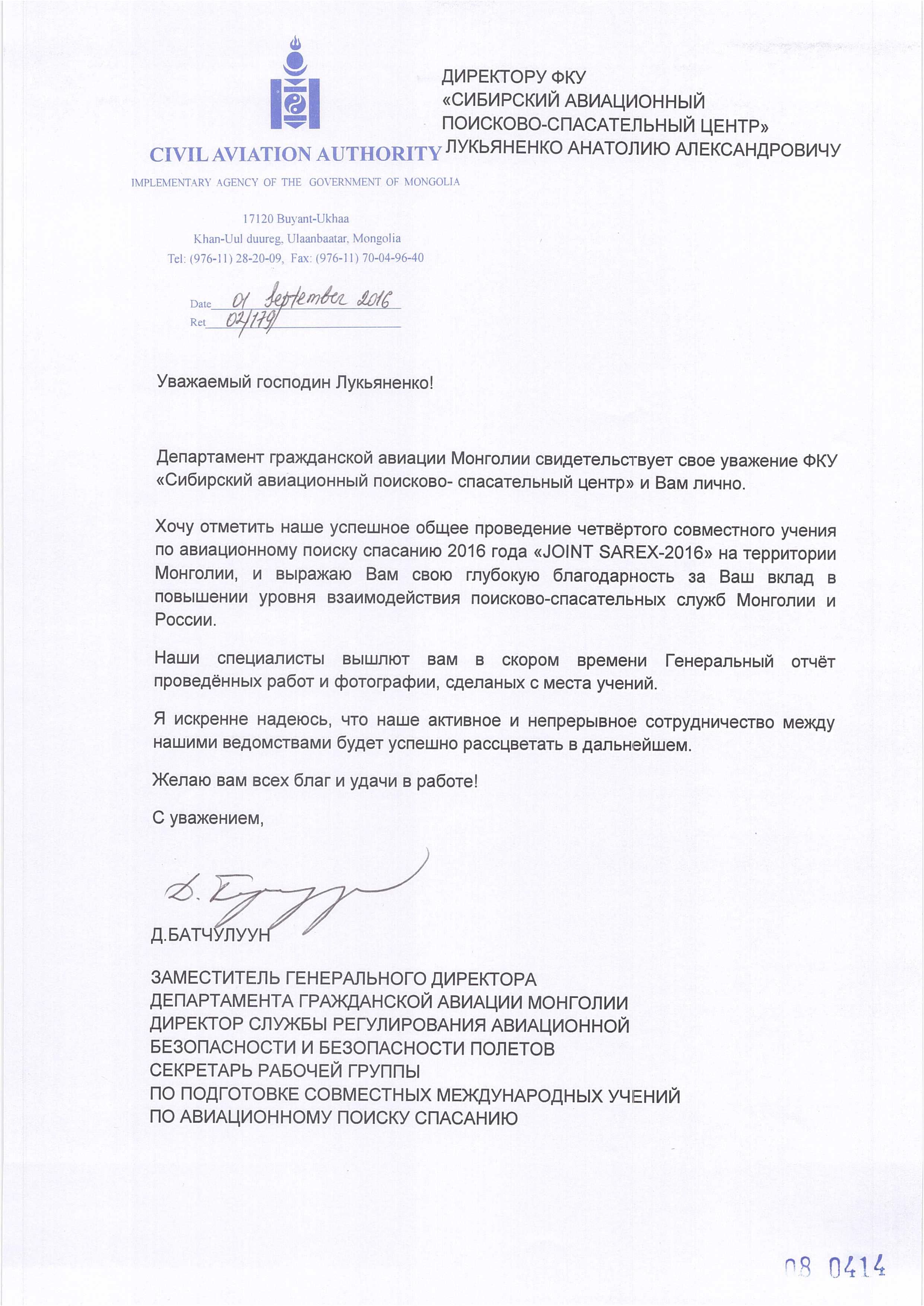 Департамент гражданской авиации Монголии выразил российской стороне благодарность за вклад в повышение уровня взаимодействия поисково-спасательных служб Монголии и России и успешное проведение четвёртого совместного учения по авиационному поиску спасанию 2016 года «JOINT SAREX-2016»