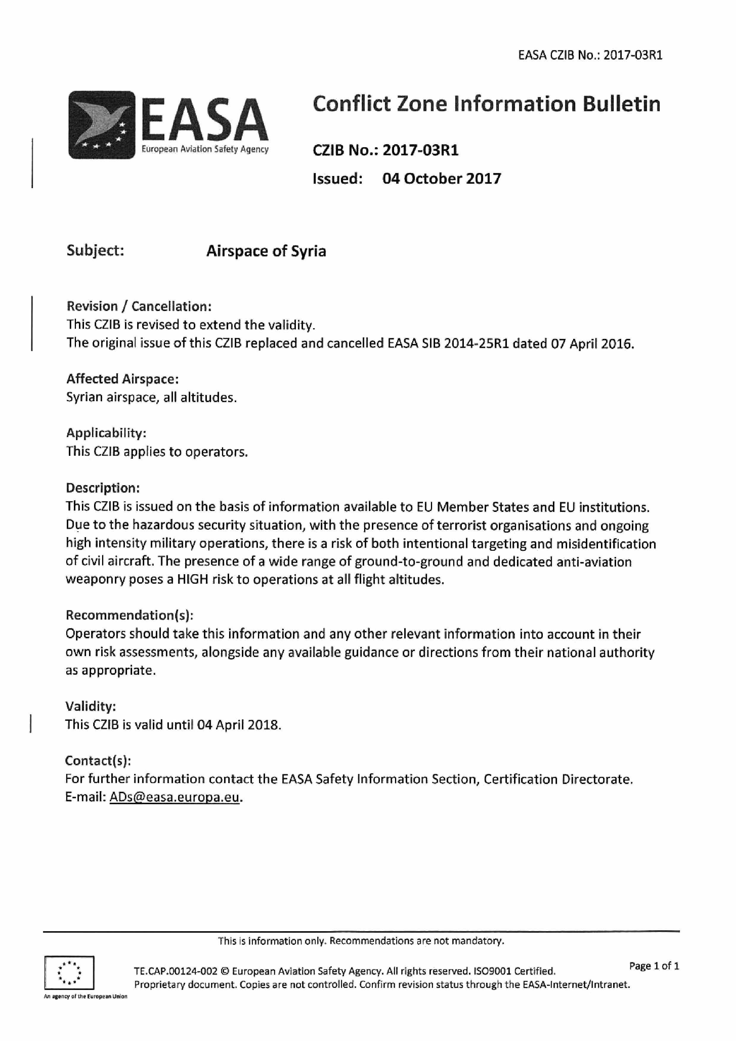 О существующих рисках для гражданских воздушных судов российских авиакомпаний в воздушном пространстве Сирийской Арабской Республики, в связи с наличием террористических организаций и продолжающимися интенсивными военными операциями