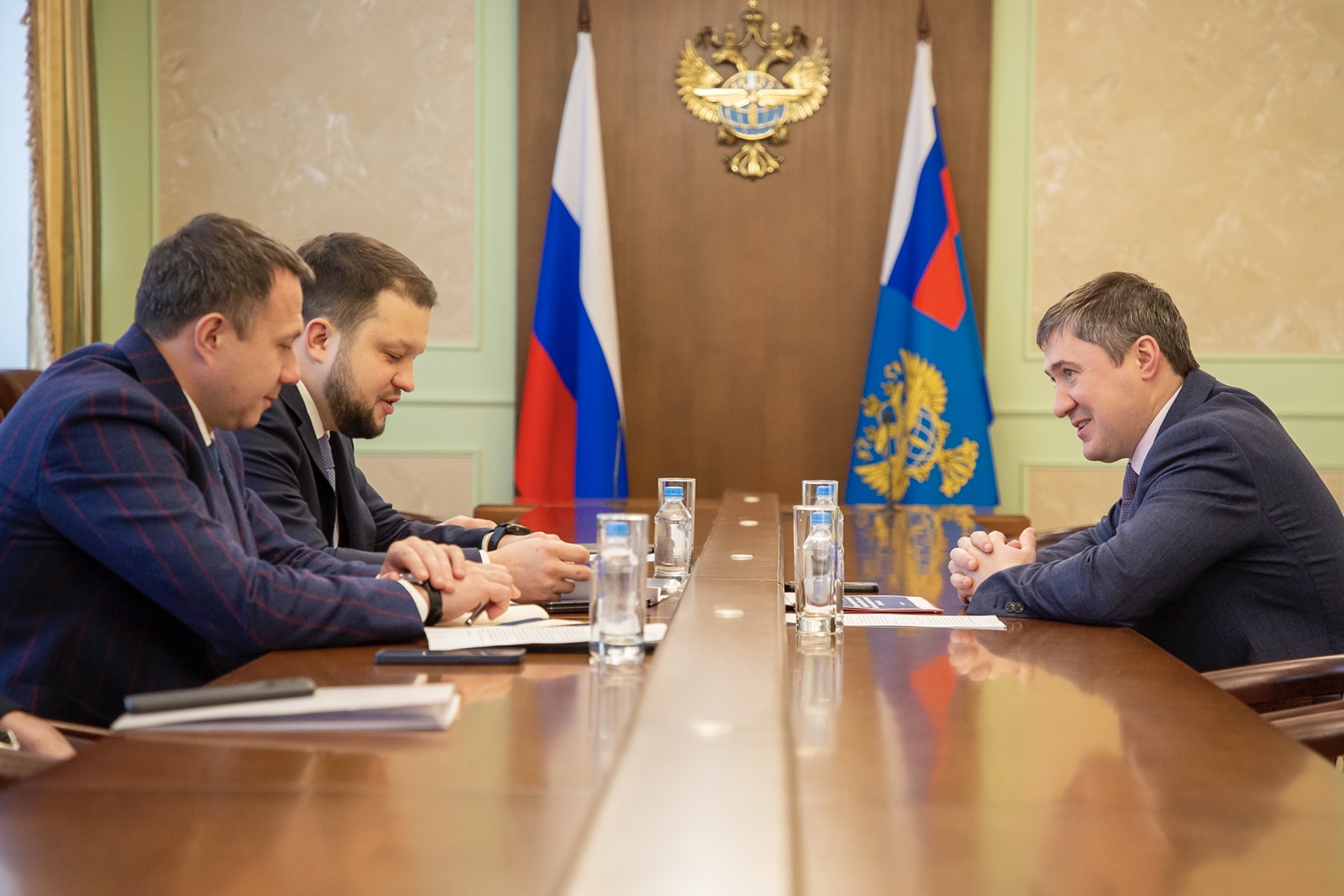 Заместитель руководителя Росавиации Андрей Добряков, глава агентства Дмитрий Ядров и губернатор Пермского края Дмитрий Махонин обсуждают перспективы развития авиации в регионе, январь 2024 года