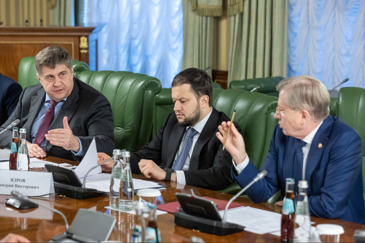 Руководитель Росавтодора Роман Новиков, Дмитрий Ядров (в центре) и Виталий Савельев на встрече с главой Северной Осетии, 26 сентября 2024 года. Фото: пресс-служба аппарата вице-премьера В.Г. Савельева
