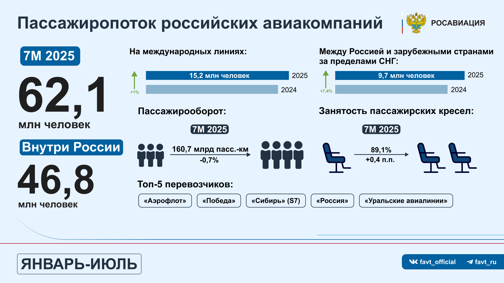 Пассажиропоток аэропортов страны составил 121,8 млн человек (-0,3 %), пассажиропоток авиакомпаний — 62,1 млн (-1,7%). Ключевой показатель, характеризующий объем работы гражданской авиации по перевозке пассажиров, — пассажирооборот за семь месяцев 2025 года снизился менее чем на один процент и составил 160,7 млрд пасс.-км. Процент занятости пассажирских кресел, напротив, увеличился на 0,4 п.п., до 89,1%.