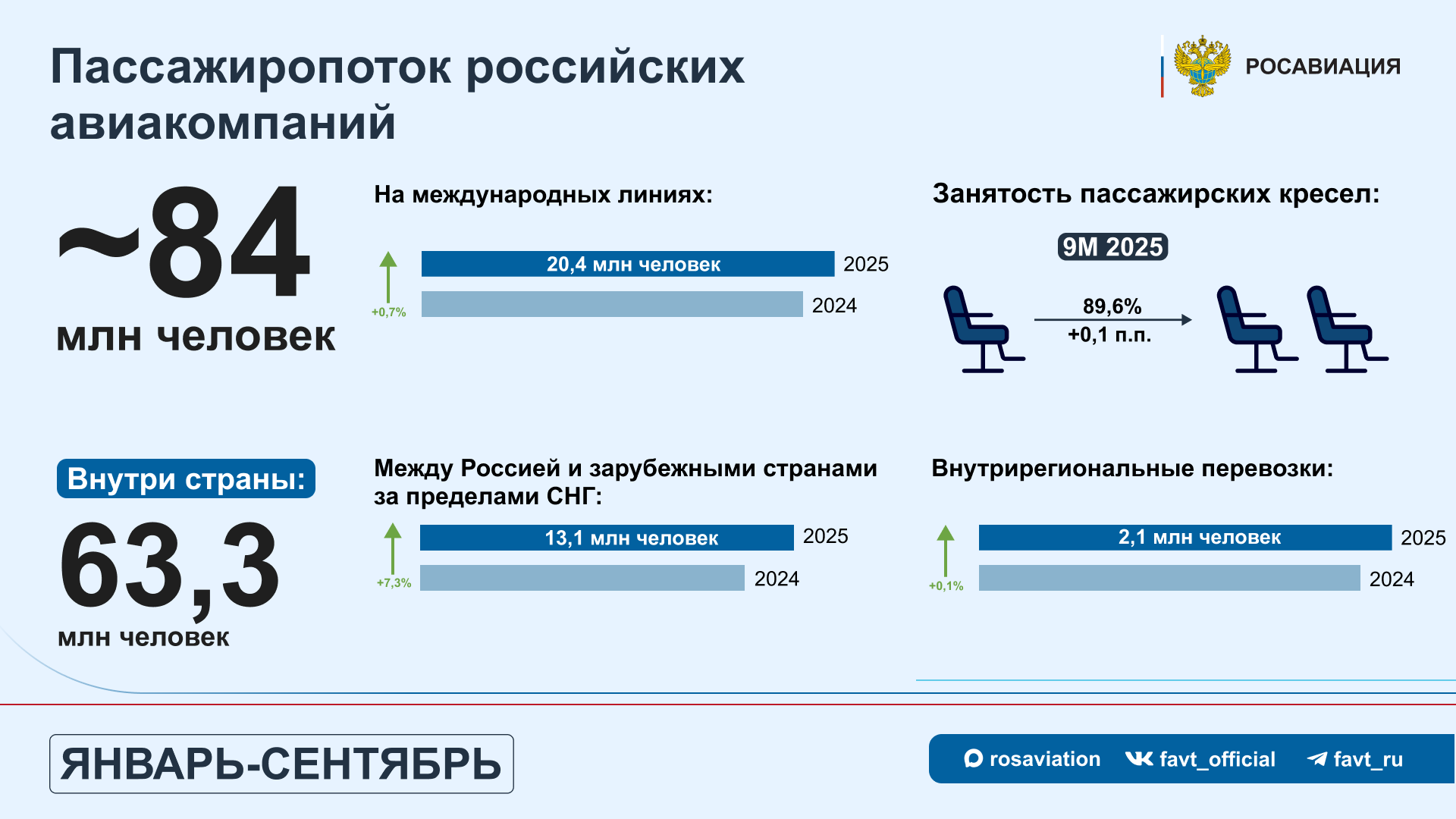 Список топ-5 авиакомпаний по числу перевезенных пассажиров остался неизменным: это «Аэрофлот», «Победа», S7 («Сибирь»), «Россия» и «Уральские авиалинии». На их долю пришлось 70,1% всех перевозок. При этом, рост пассажиропотока по результатам девяти месяцев этого года отмечается у «России» – более 5% (по сравнению с тем же периодом 2024 года) и «Победы» – более 1 %.