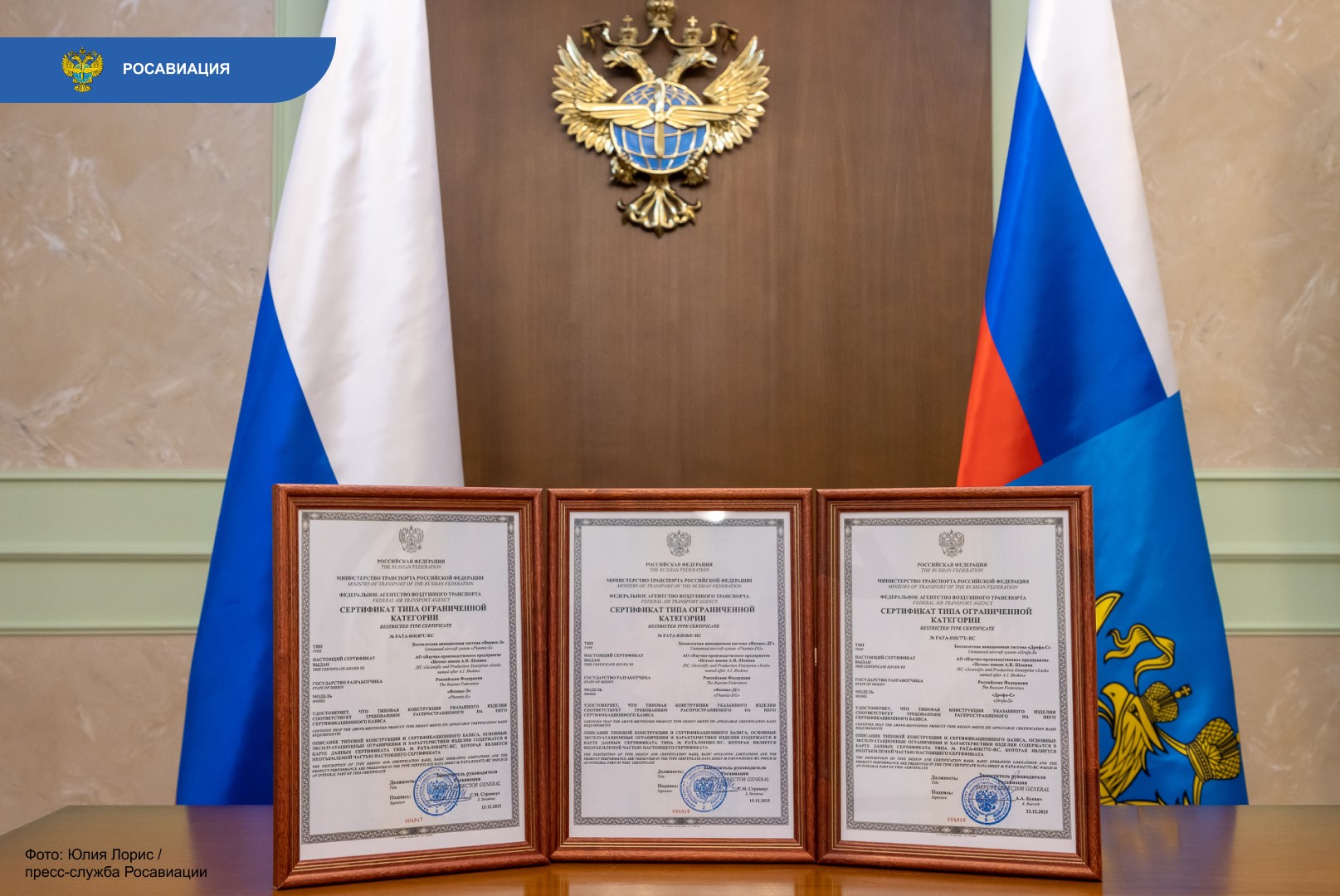 Росавиация выдала сертификаты типа на три агродрона – «Феникс-Э», «Феникс-ДГ» и «Дрофа», разработанные научно-производственным предприятием «Исток» (входит в Холдинг «Росэл» Госкорпорации «Ростех»). Теперь в России восемь сертифицированных типов БАС. Документы вручил замруководителя агентства Андрей Потемкин, курирующий вопросы развития БАС. Этим летом организация была сертифицирована Росавиацией как разработчик гражданских беспилотных авиационных систем.