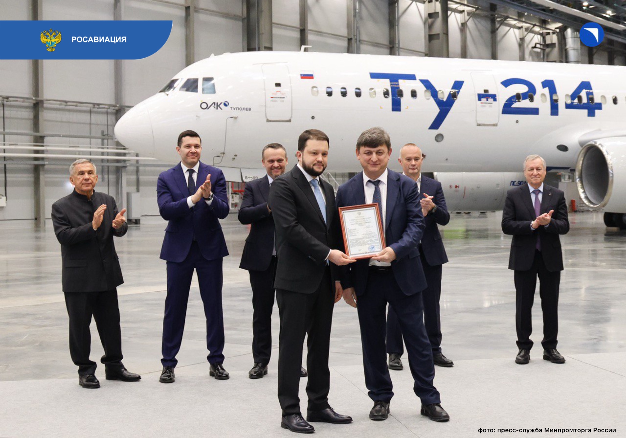 Сегодня в Казани руководитель Росавиации Дмитрий Ядров вручил первому заместителю управляющего директора АО «Туполев» – директору КАЗ им. С.П. Горбунова (входит в ОАК Госкорпорации Ростех) Зуфару Миргалимову свидетельство об Одобрении главного изменения типовой конструкции самолета Ту-214 с современным отечественным комплексом бортового радио-электронного оборудования и комплектующими, включая передовые системы безопасности. Соответствие нового оборудования заявленным требованиям подтвердил подведомственный Росавиации Авиарегистр России.