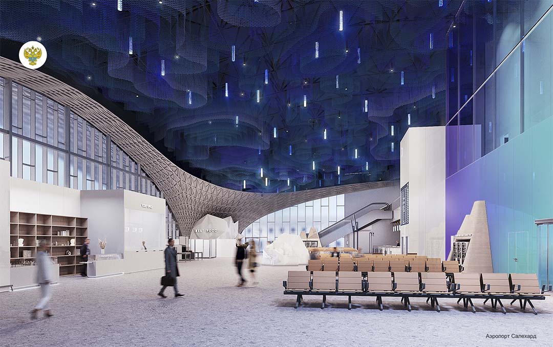 Проектировщики учитывали исторические и природные особенности региона, стараясь передать атмосферу сурового края. Например, на потолке аэровокзала изобразили Северное сияние