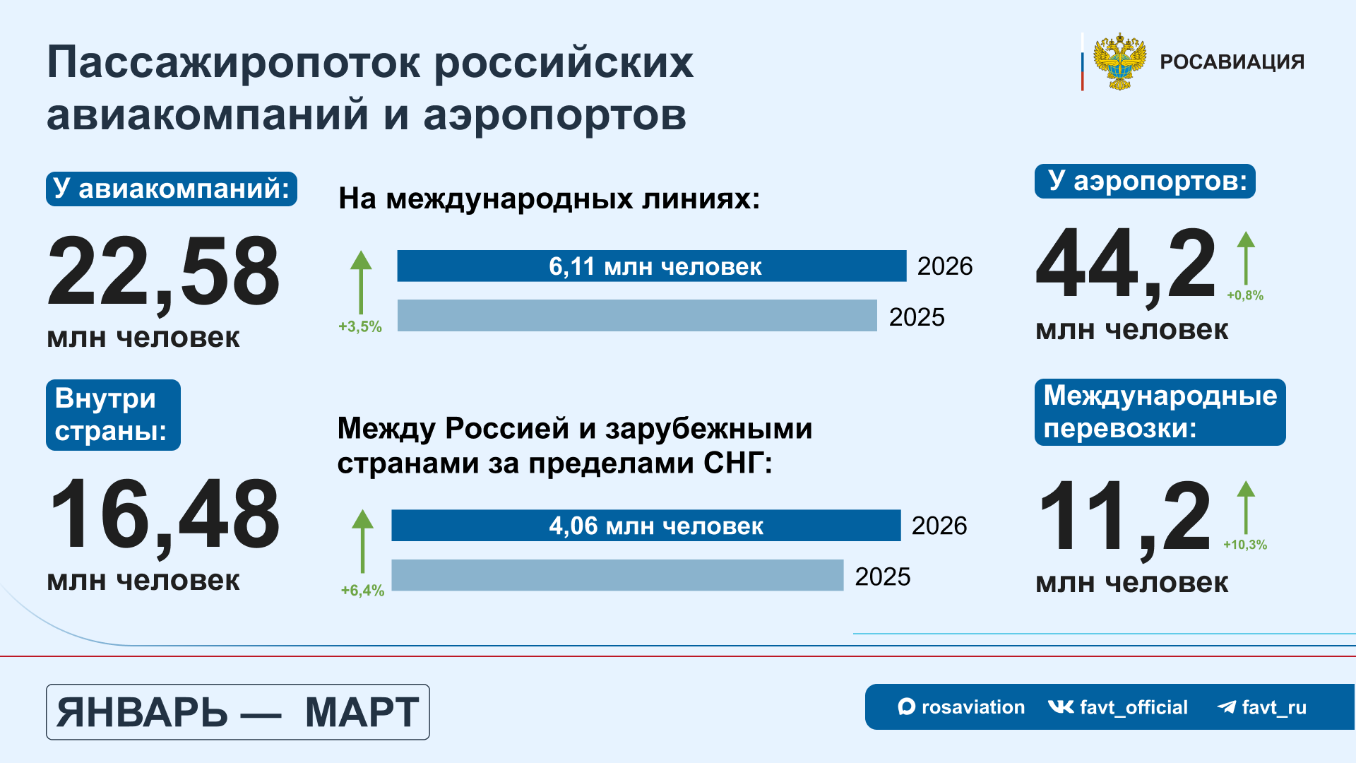 22,58 млн. человек составил пассажиропоток российских авиакомпаний в январе-марте 2026 года. Основной объем (73%) приходится на внутренние перевозки – 16,48 млн. пассажиров. На международных линиях авиакомпании перевезли 6,11 млн. человек, рост к I кварталу прошлого года составил 3,5%. При этом, наибольшее увеличение зафиксировано на рейсах между Россией и странами за пределами СНГ – 6,4%, 4,06 млн человек. Рост международных перевозок фиксируется и в показателях российских аэропортов – 11,2 млн (+10,3 %). В целом, в январе-марте авиагавани обслужили 44,2 млн (+0,8 %).