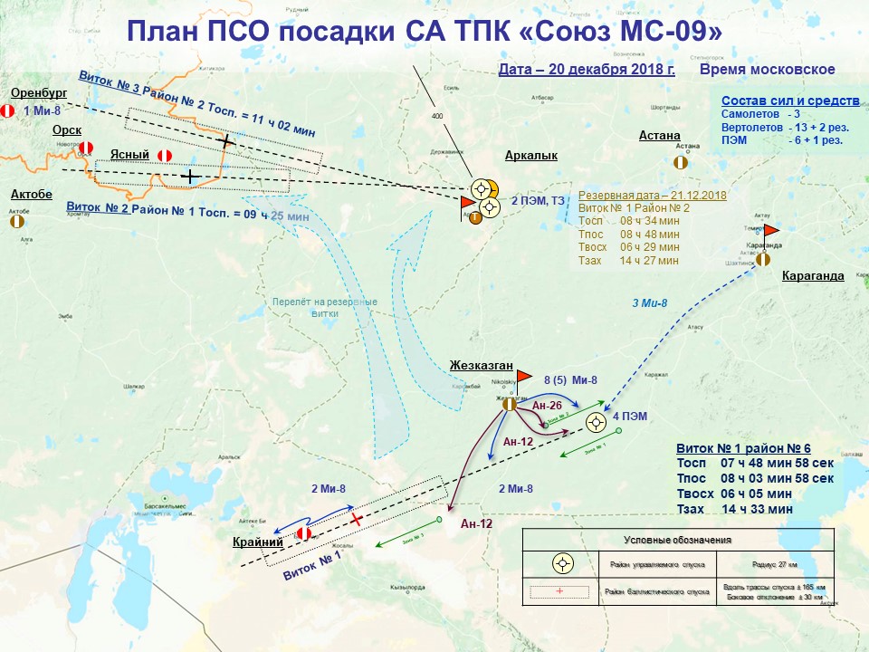 В соответствии с программой полета МКС, расчетное время посадки – 08:06:10 (мск) (резервный день – 21 декабря). Посадочной комиссией пригодным для проведения поисково-спасательных работ признан т.н. 6-й район, расположенный в 145 км к юго-востоку от г. Жезказган Карагандинской области Республики Казахстан.