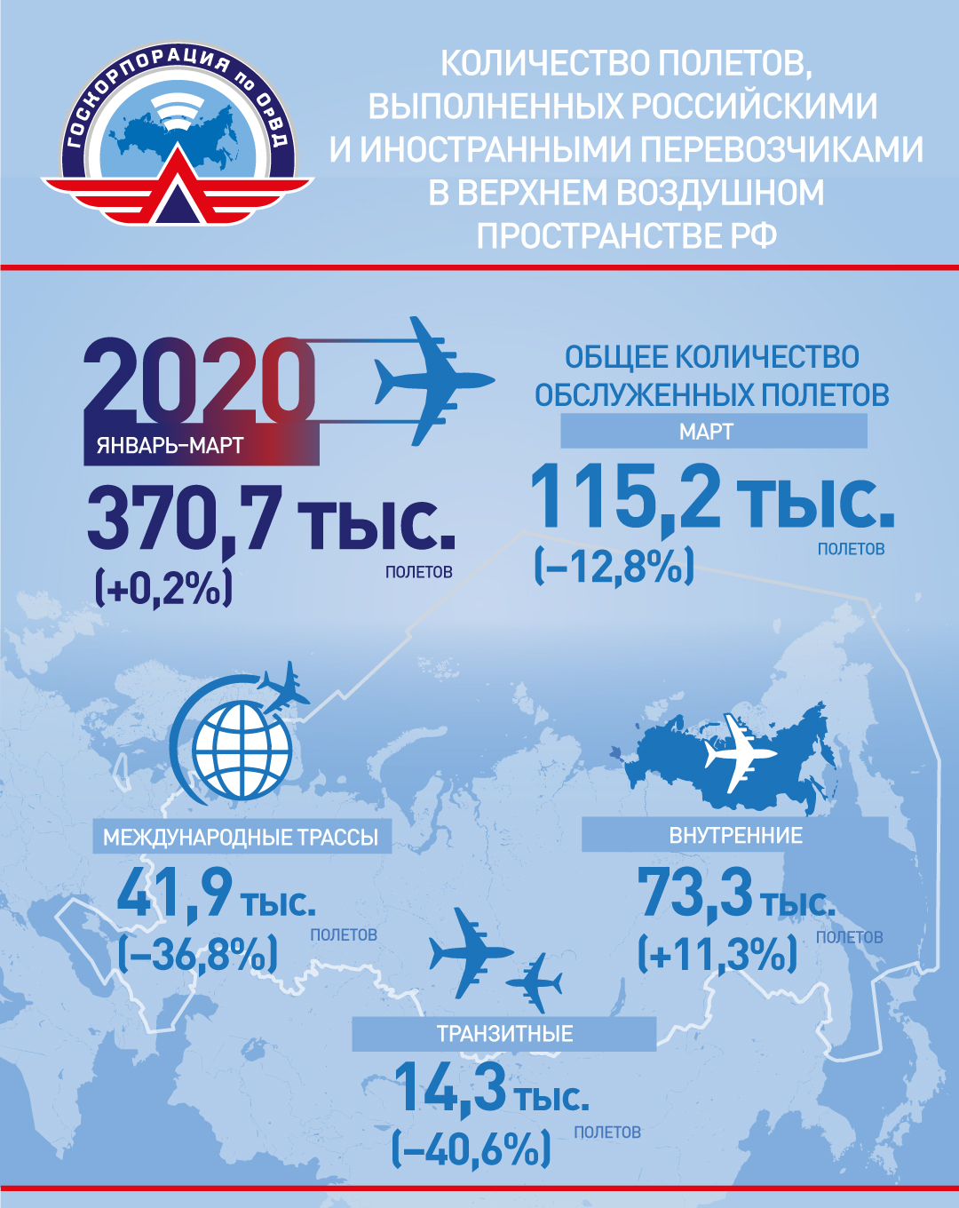 Статистические данные за март 2020 показывают снижение интенсивности использования воздушного пространства РФ на фоне введенных ограничений в связи с предупреждением распространения коронавирусной инфекции.