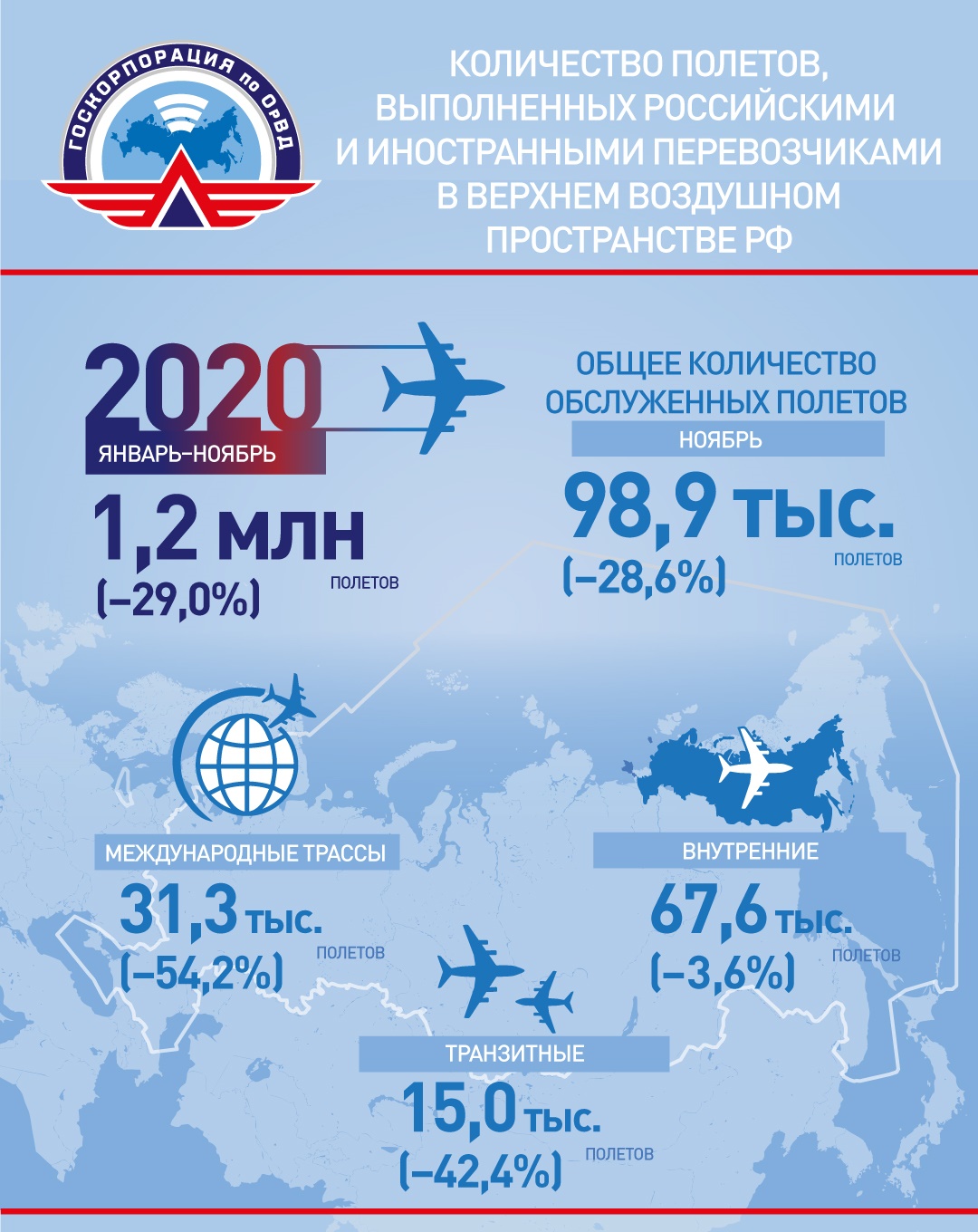 В ноябре 2020 года российские авиадиспетчеры обслужили в верхнем воздушном пространстве страны 98,9 тыс. полётов, что на -28,6% ниже показателя относительно того же периода прошлого года. При этом внутренних полёты составили 67,6 тыс.полетов (-3,6%) и международные – 31,3 тыс.полетов (-54,2%).