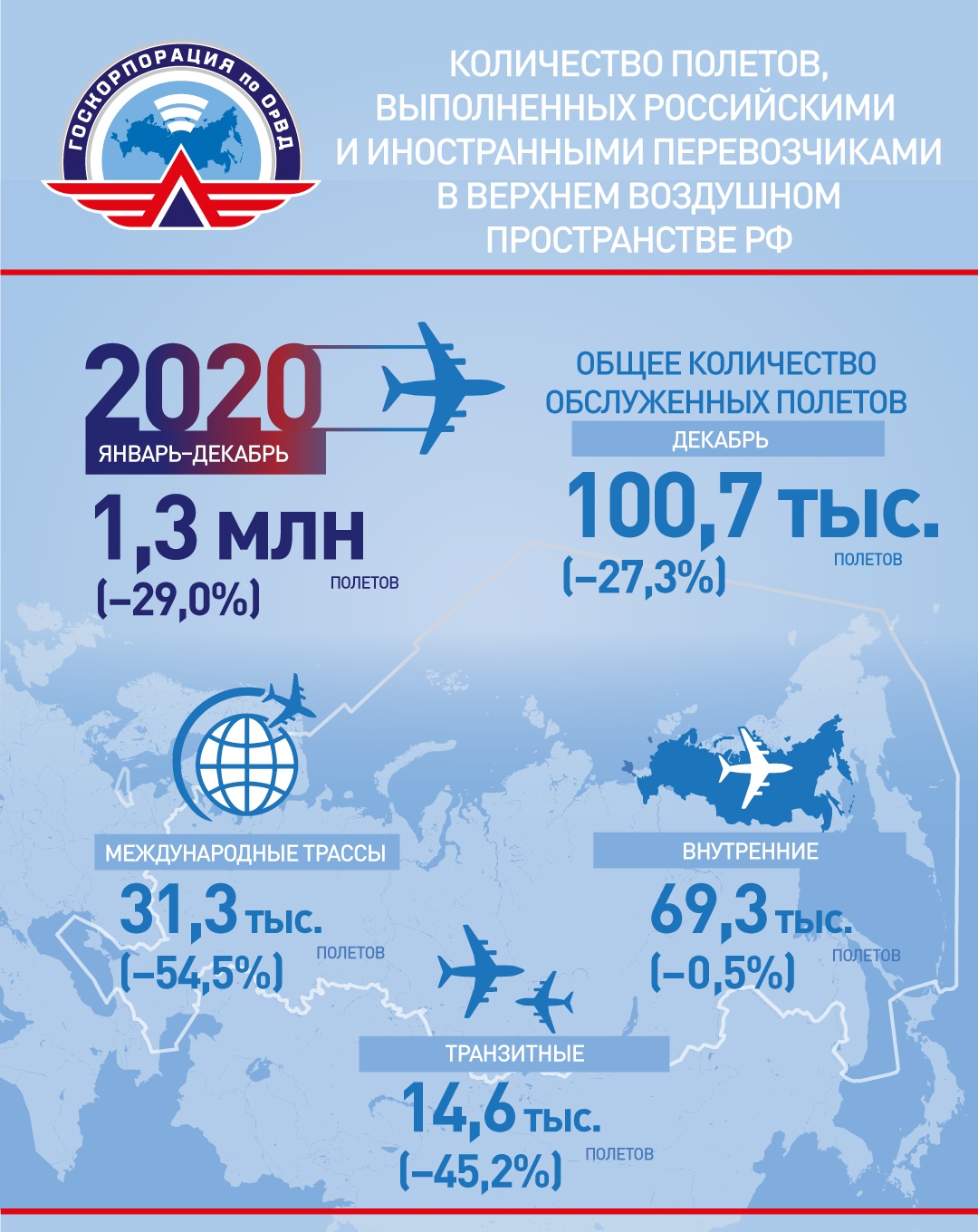 В 2020 году российские авиадиспетчеры обслужили в верхнем воздушном пространстве страны 1,3 млн. полётов, что на 29% ниже показателя относительно того же периода 2019 года. При этом внутренних полёты составили 909,3 тыс.полетов (-3%) и международные – 389,8 тыс.полетов (-44%).
