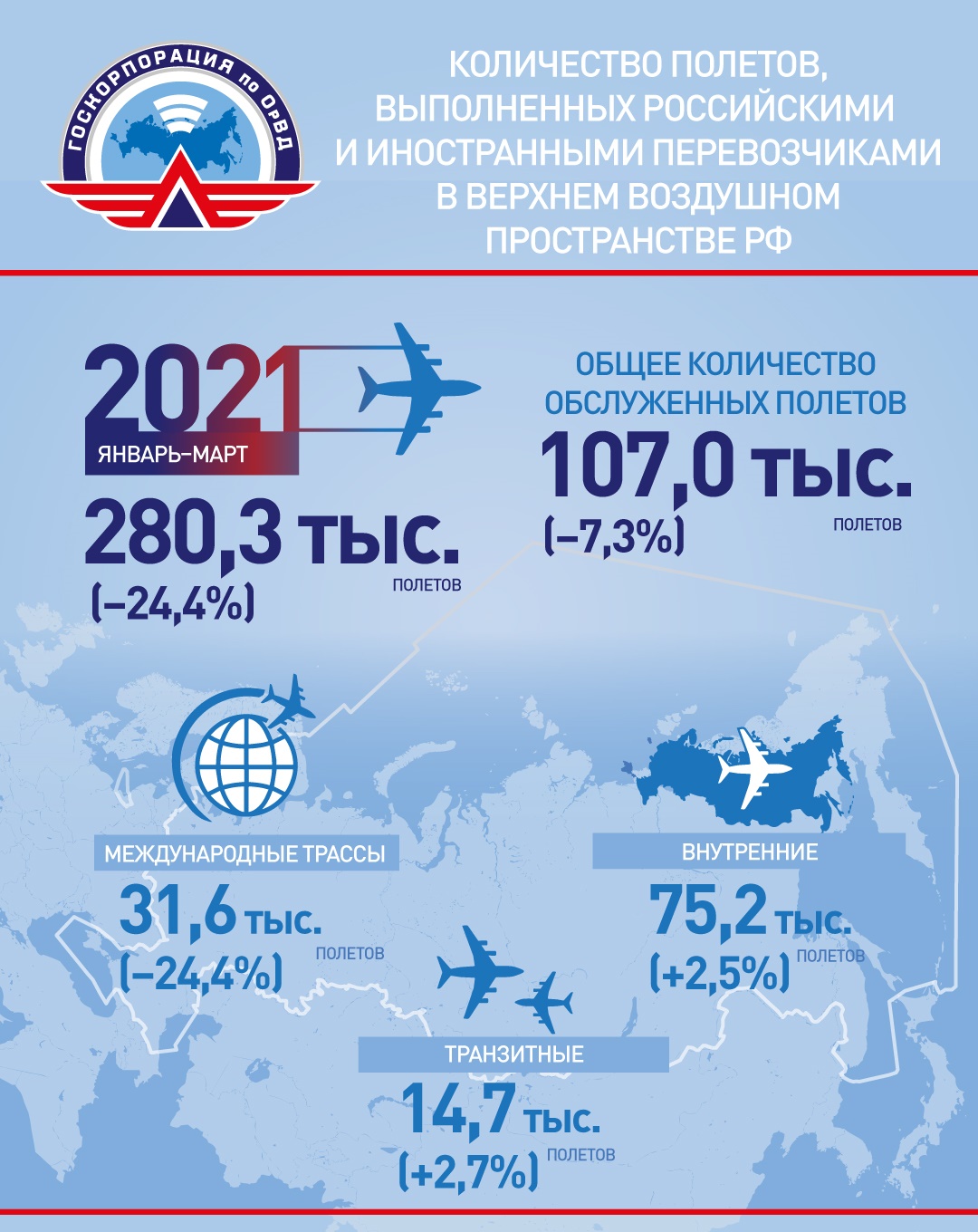 В марте 2021 года российские авиадиспетчеры обслужили в верхнем воздушном пространстве страны 107 тыс. полётов, уменьшив этот показатель относительно того же периода прошлого года на 7,3 %.
