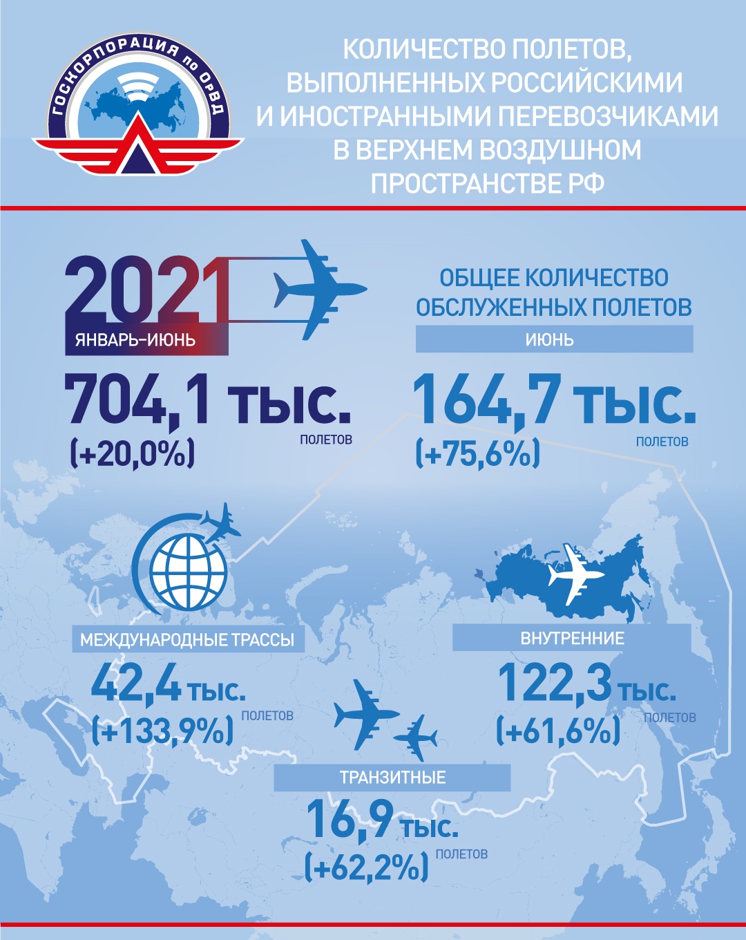 В июне 2021 года российские авиадиспетчеры обслужили в верхнем воздушном пространстве страны 164.7 тыс. полётов, что на +76% больше показателя относительно того же периода прошлого года. Отмечается рост внутренних полётов – 122,3 тыс. полетов (+61%).