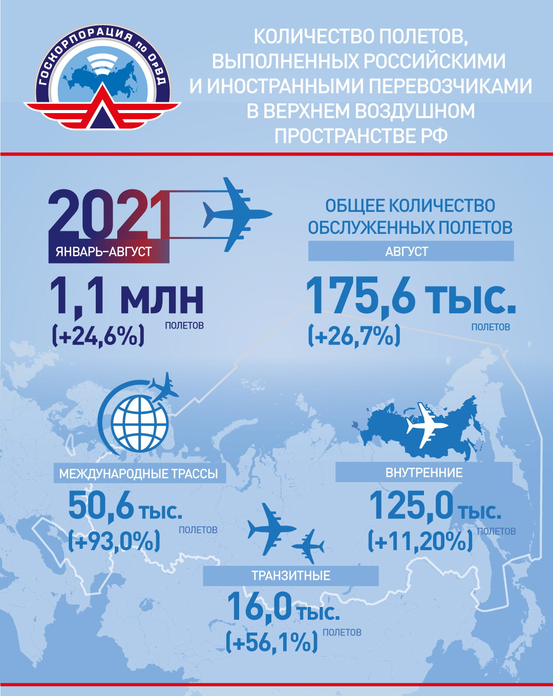 Всего за восемь месяцев 2021 российские авиадиспетчеры обслужили около 1,1 млн. полётов. Число внутренних полётов составило 760,9 тыс. полетов. На международных воздушных линиях выполнено 296,2 тыс. полётов, включая 120 тыс. транзитных полётов.