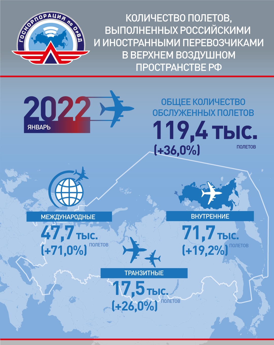 В январе 2022 года российские авиадиспетчеры обслужили в верхнем воздушном пространстве страны 119,4 тыс. полётов, при этом 60% составляют полеты по внутренним воздушным трассам. В сравнении с январем 2021 года количество полетов увеличилось на +36 %.