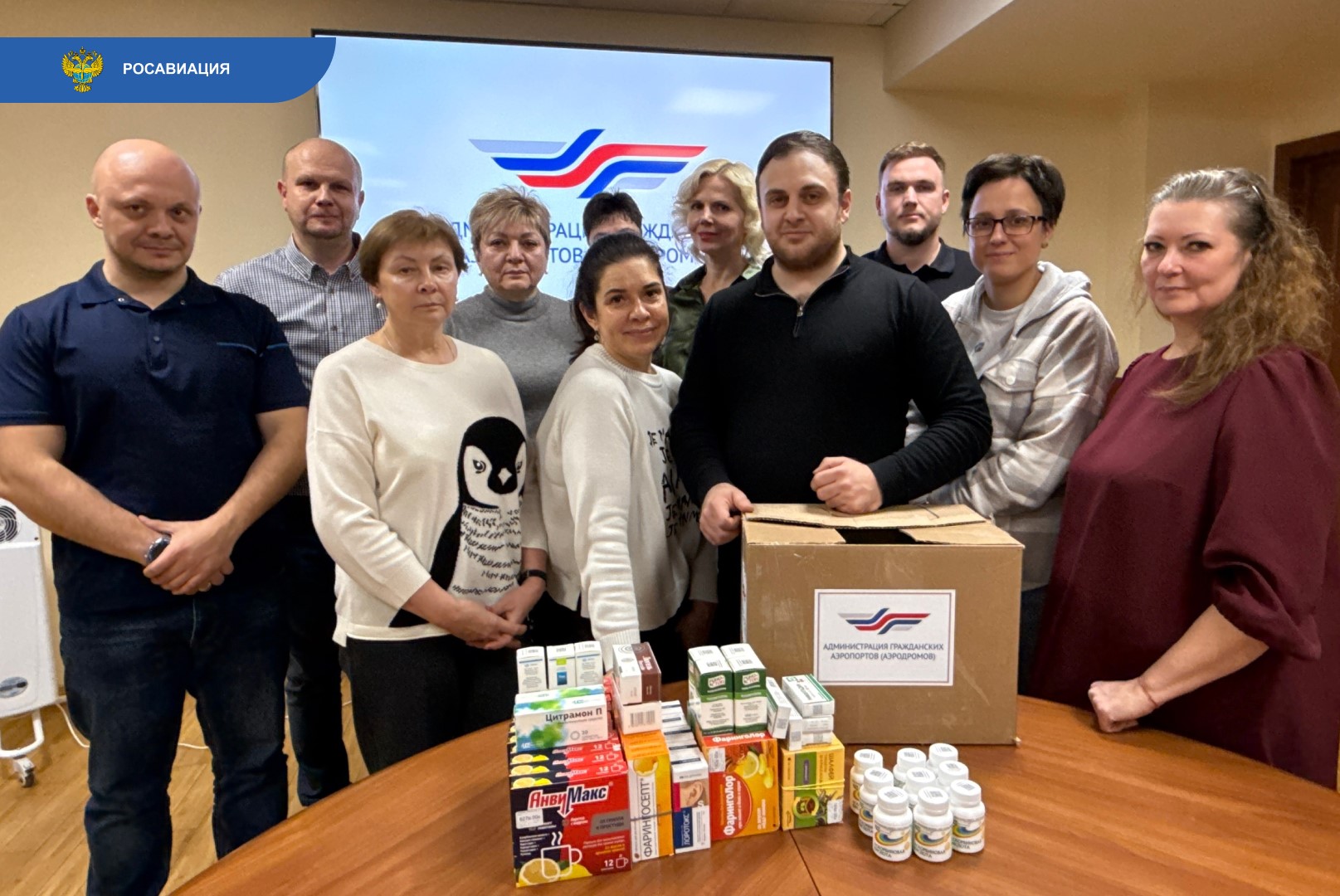 • Коллектив «Администрации гражданских аэропортов (аэродромов)» (ФГУП «АГА (А)») подготовил объемную посылку с медикаментами. На собранные добровольные пожертвования закупили т. н. «гражданскую аптечку» — лекарства от простудных заболеваний, которые постоянно необходимы бойцам в полевых условиях, а также партию тактической медицины. Посылку в рамках акции «Россия – семья семей» сформировали по запросу военных медиков в полевые госпитали на Донецкое и Курское направления.