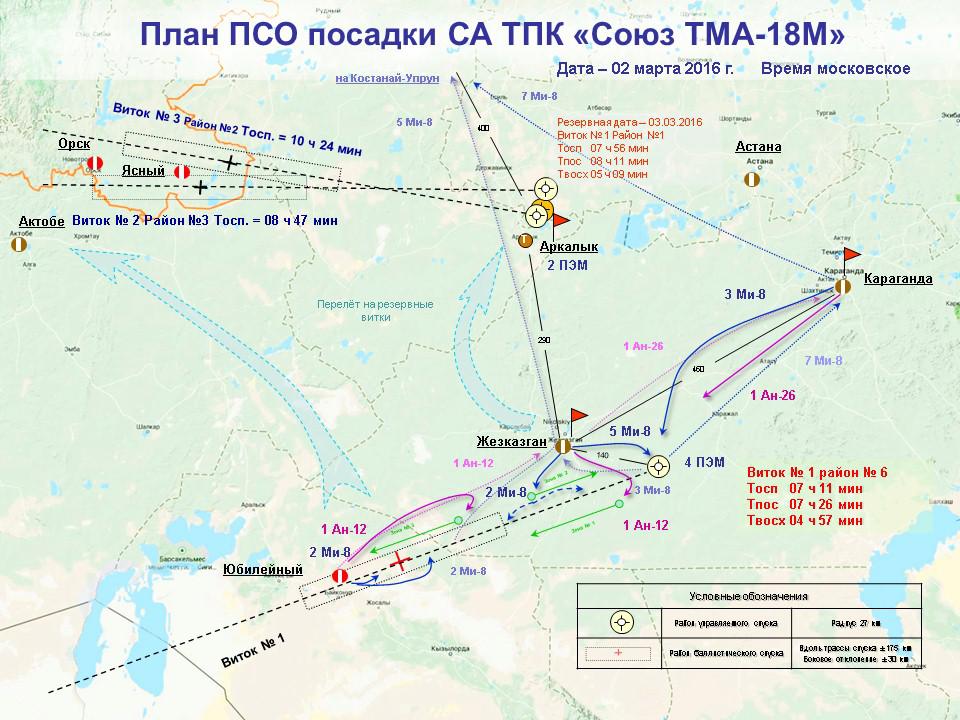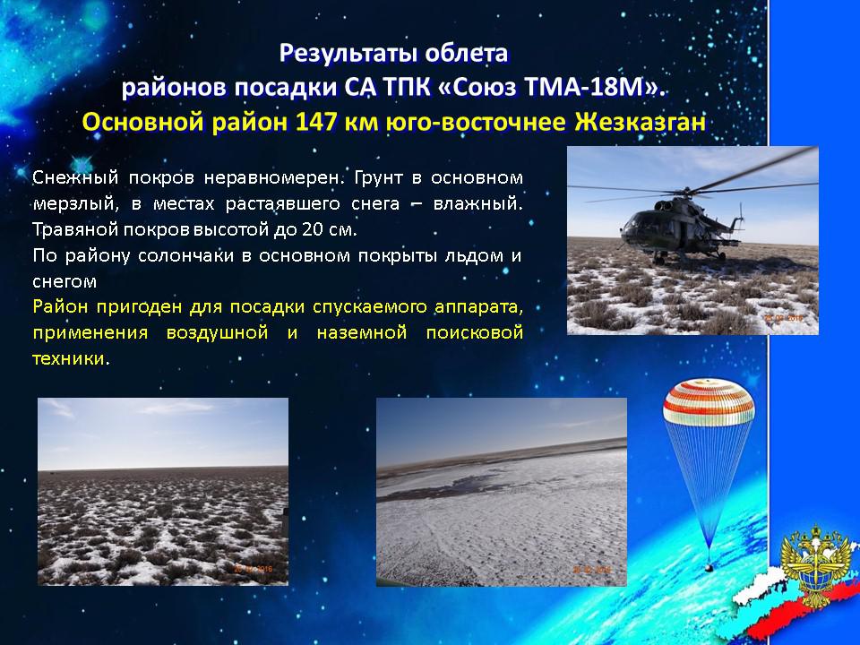 Росавиация сосредоточила поисково-спасательные силы и средства для обеспечения посадки спускаемого аппарата транспортно-пилотируемого корабля «Союз ТМА-18М», намеченной на 02 марта 2016 года