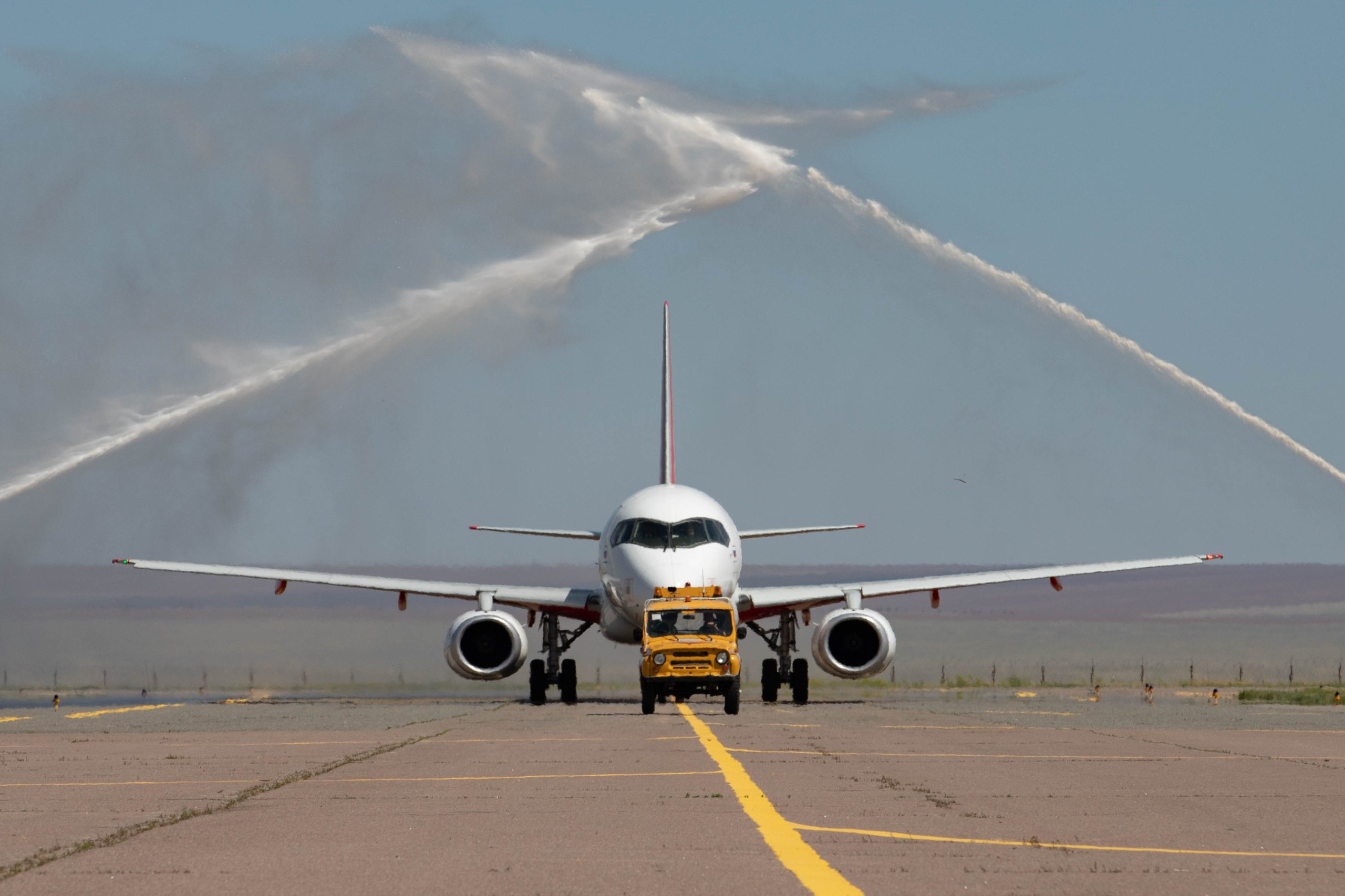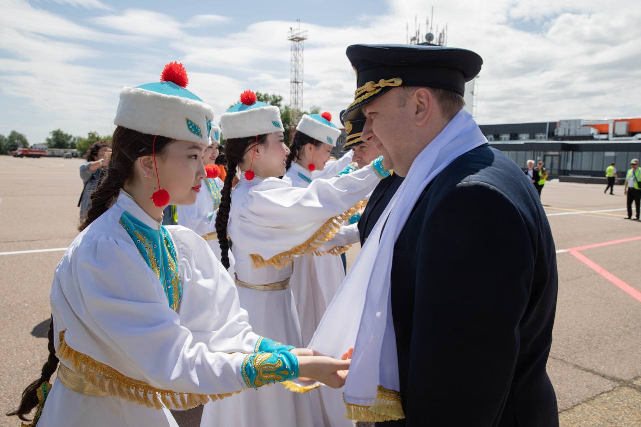 Самолет торжественно встретили водной аркой, а пилотам в знак приветствия надели хадак — традиционный калмыцкий белый шарф.