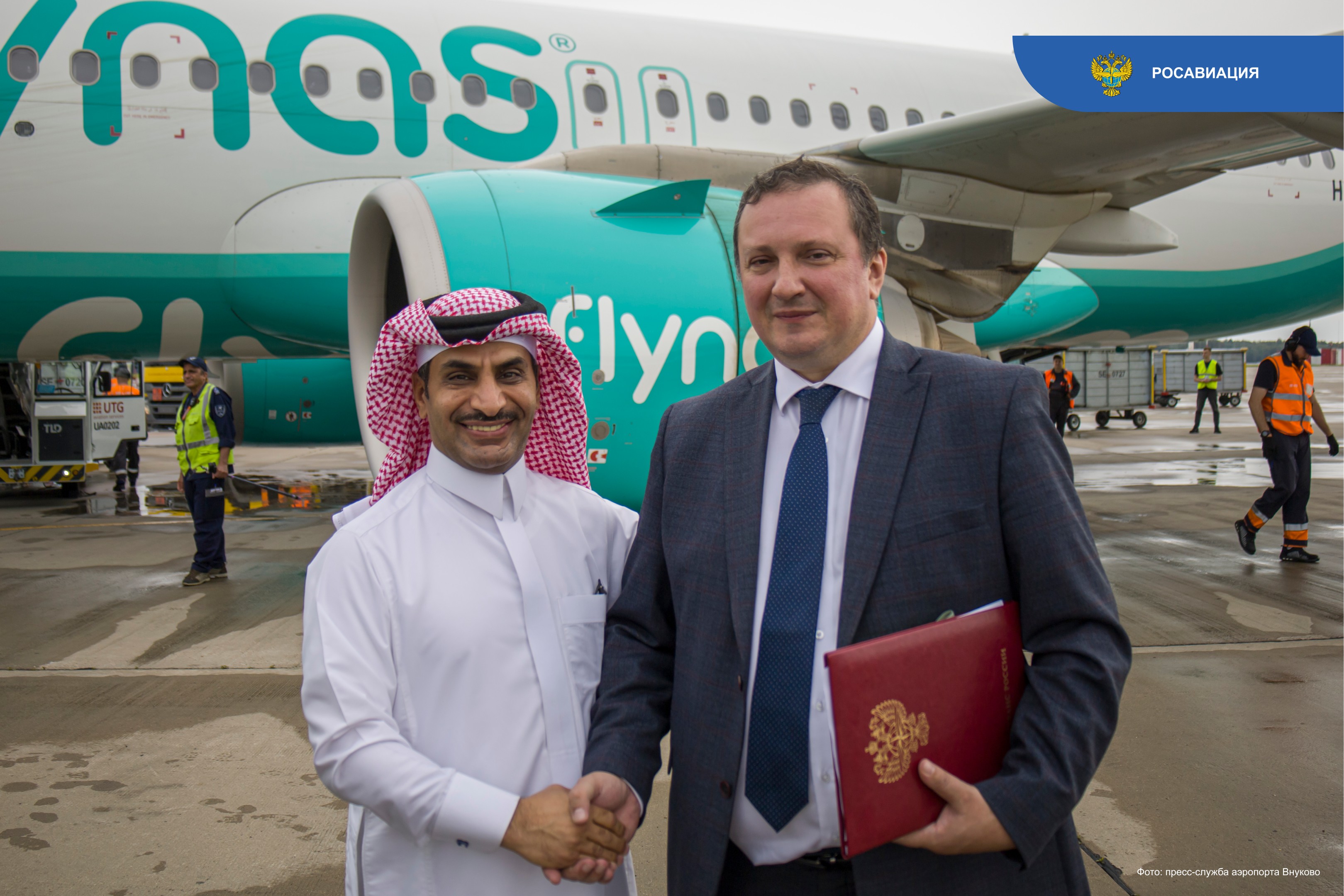 Регулярное воздушное сообщение между Россией и Саудовской Аравией открыли сегодня, 1 августа. В Москву из Эр-Рияда прибыл первый рейс авиакомпании Flynas. Самолет Airbus A320 преодолел расстояние между столицами государств за 5,5 часов. В аэропорту Внуково лайнер по традиции встретили водной аркой. Пассажиров и экипаж дебютного рейса приветствовал заместитель министра транспорта России Владимир Потешкин и замруководителя Росавиации Алексей Буевич.