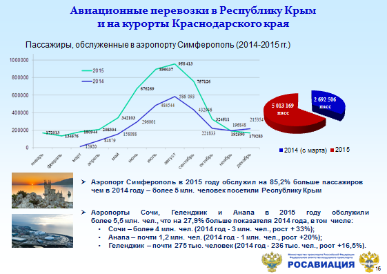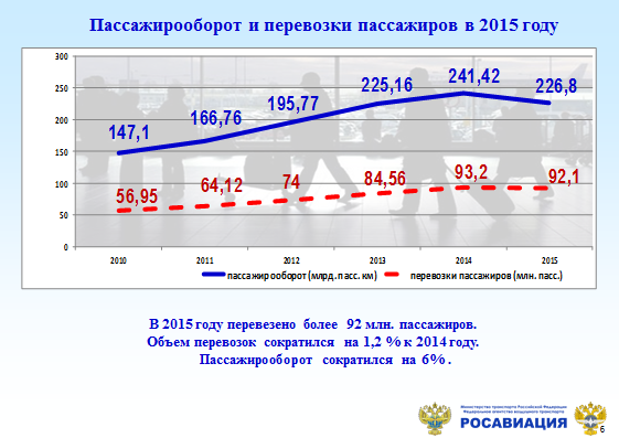Уважаемые коллеги, производственная деятельность воздушного транспорта в прошлом году осуществлялась под влиянием известных внешнеполитических и внутриэкономических факторов. Тем не менее, количество перевезённых пассажиров на воздушном транспорте в 2015-м году снизилось всего лишь на 1% - с 93 до 92 миллионов пассажиров.