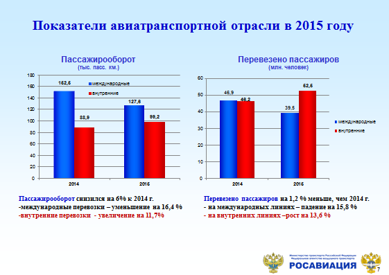 В последнее время значительное внимание уделялось именно развитию внутренних воздушных перевозок. В 2015-м году впервые в истории Российской Федерации на внутренних воздушных линиях количество перевезённых пассажиров превысило пассажиропоток на международных направлениях.