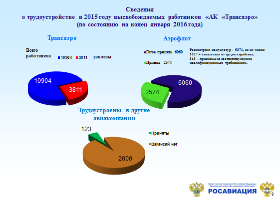 Самые неприятные последствия в этой ситуации испытали рядовые сотрудники авиаперевозчика. Без работы остались почти 11 тысяч квалифицированных работников. Очевидно то, что мгновенно их было невозможно трудоустроить в другие организации отрасли. Вместе с тем, «Аэрофлот», как и собирался сделать, открыл более 6 тысяч вакансий в авиакомпаниях своей группы. По мере перевода самолетов «Трансаэро» в парк «Аэрофлота» и компаний его группы будет осуществляться дополнительный прием персонала. Другие организации отрасли также предоставляют возможности для трудоустройства персонала лишившегося сертификата перевозчика. В настоящее время трудоустроено около 4 тыс. сотрудников предприятия. С учетом незначительно изменившегося спроса на авиаперевозки в стране имеется уверенность в том, что проблема с трудоустройством квалифицированного лётного и технического персонала перевозчика будет решена. Эта задача должна оставаться в нашем поле внимания до ее окончательного решения.