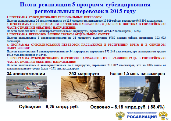 Росту пассажиропотока на внутренних линиях содействует реализация 5 программ субсидирования, в рамках которых полеты в 2015 году выполняли 34 авиакомпании по 253 маршрутам. Это программы перевозок из центральной части России на Дальний Восток, в Приволжском федеральном округе, программа региональных перевозок и формирования региональной маршрутной сети, перевозки в Калининград и в Симферополь.