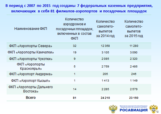 Функционирование федеральных казённых предприятий позволяет поддерживать в эксплуатационном состоянии аэропорты с низкой интенсивностью полётов. На их содержание в федеральном бюджете выделено 3,4 млрд. рублей.