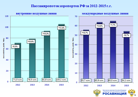 Количество пассажиров, обслуживаемых российскими аэропортами, увеличилось с 126,7 в 2012 году до 159,3 млн. человек в 2015 году, превысив показатели 2014 года на 1,5 млн. человек. В структуре этого показателя почти на 17 % снизилось количество обслуженных пассажиров на международных линиях при росте на 13,4% обслуживания на внутренних маршрутах.