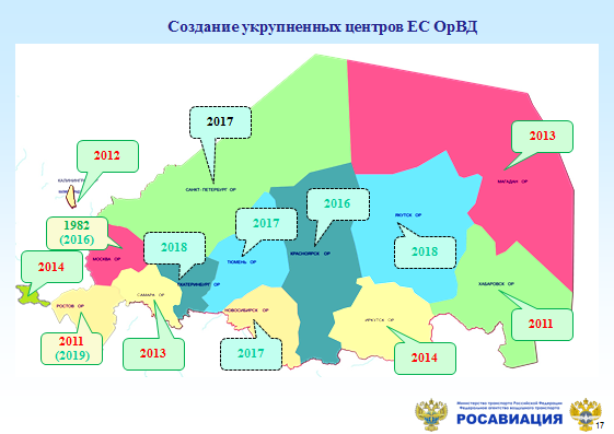 Развитие внутренних перевозок связано не только с аэропортовой инфраструктурой, но и с совершенствованием Единой системы организации воздушного движения. В гражданской авиации реализуется ФЦП «Модернизации Единой системы организации воздушного движения до 2020 года». Важнейшим мероприятием по реализации этой программы является создание 14 укрупненных центров. В настоящее время построены, введены в эксплуатацию и успешно функционируют укрупненные центры в Хабаровске, Самаре, Магадане Иркутске, в Калининграде, Ростове-на-Дону. Идёт монтаж оборудования в Красноярске. Началось и продолжается строительство центров в Тюмени и Санкт-Петербурге, в Новосибирске. В кратчайшие сроки полностью переоснащен Симферопольский центр управления воздушным движением. Во всех укрупненных центрах фактически проведена замена систем связи, навигации и наблюдения. Комплекс этих работ позволяет существенно нарастить объем покрытия радиолокационным наблюдением и радиосвязью над территорией России.