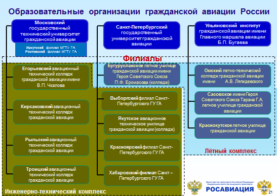 Подготовку специалистов гражданской авиации осуществляют образовательные организации, подведомственные Росавиации, которые объединены в вертикально интегрированные комплексы.