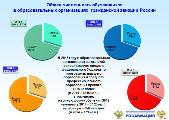 В 2015 году общая численность обучающихся в учебных заведениях гражданской авиации составила 25 632 человека, из них 68% обучалось за счет средств федерального бюджета, а 32% - на платной основе.