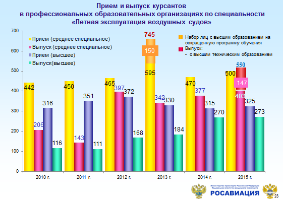 Данные по приему и выпуску по летным специальностям в образовательных организациях гражданской авиации в 2015 году представлены на слайде.