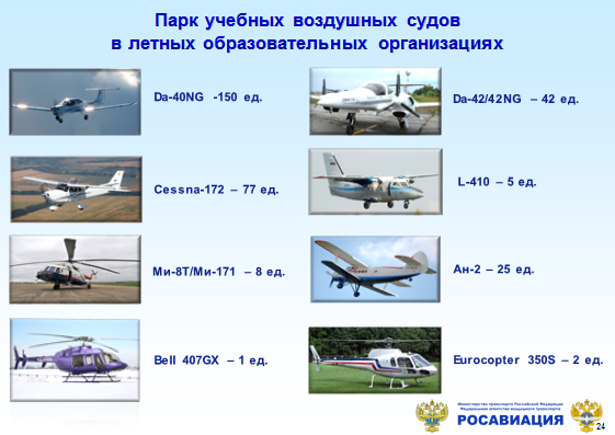 В целях осуществления качественной реализации программ подготовки пилотов и обеспечения безопасности полетов в 2015 году в образовательные организации гражданской авиации поставлено 21 воздушное судно, из них первоначального обучения – 14 ед. (13 ВС Cessna-172S в Ульяновский институт ГА и 1 вертолет Bell407GX в Омский летно-технический колледж), выпускных – 7 ВС DA-42NG в Санкт-Петербургский государственный университет ГА, а также 31 тренажер.