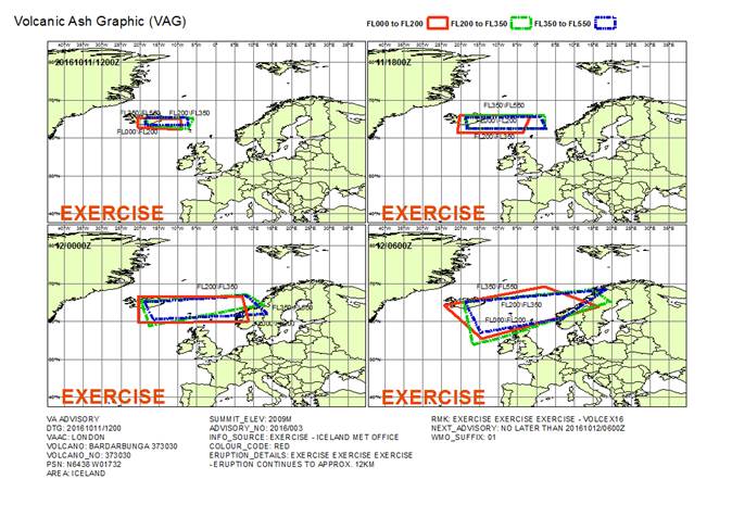 Во время учений будет моделироваться извержение вулкана Bardarbunga (Исландия). Предполагается, что облако вулканического пепла (VA CLD) окажет влияние на воздушное пространство Российской Федерации 12 октября 2016 года после 16:00 UTC (FIRs Moscow, Vologda, Saint-Petersburg, Kaliningrad).