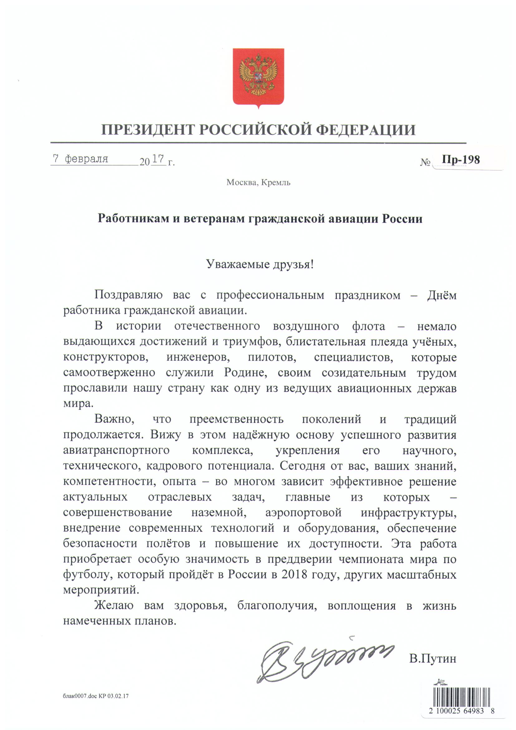Поздравление Президента Российской Федерации Владимира Путина с Днём работника гражданской авиации