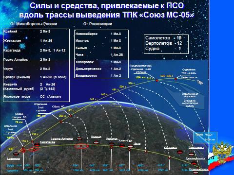 Поисково-спасательные силы расположатся на космодроме и вдоль трассы выведения транспортно-пилотируемого корабля на орбиту в следующих пунктах: Крайний (Юбилейный), Караганда, Горно-Алтайск, Кызыл, Иркутск, Улан-Удэ, Чита, Хабаровск, Николаевка, Дальнереченск, Владивосток и др.