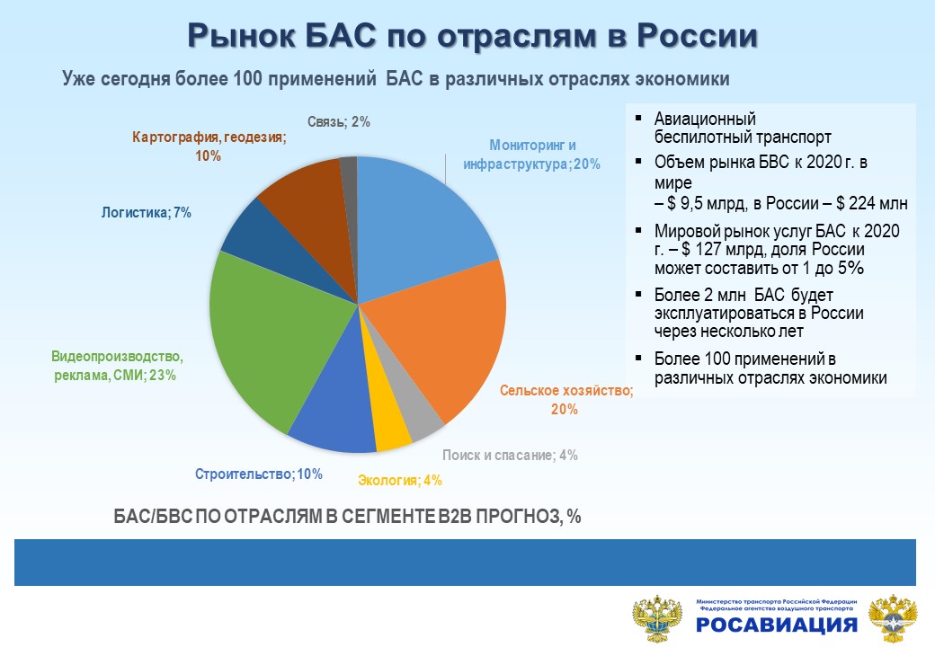 Рынок БАС по отраслям в России требует новых подходов к регулированию и новые специализированные подходы в выработке и применению технических и технологических решений. В совместных интересах государства и бизнеса найти компромисс между обеспечением безопасности и развитием перспективного инновационного рынка БАС.