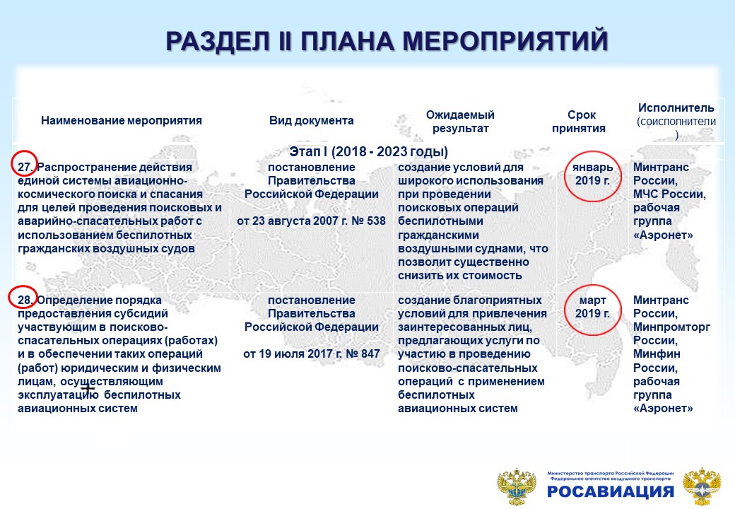 Пунктами № 28 и 29 указанного Распоряжением Правительства предписывается разработать постановления Правительства РФ, распространяющие действия ЕС АКПС с использованием БАС и определяющими порядок предоставления субсидий, участвующим в ПСО юридическим и физическим лицам. Ожидаемые результаты: создание условий для широкого использования при проведении ПСО БАС, что позволит существенно снизить их стоимость и одновременно проводить ПСО в ночное время и в СМУ.