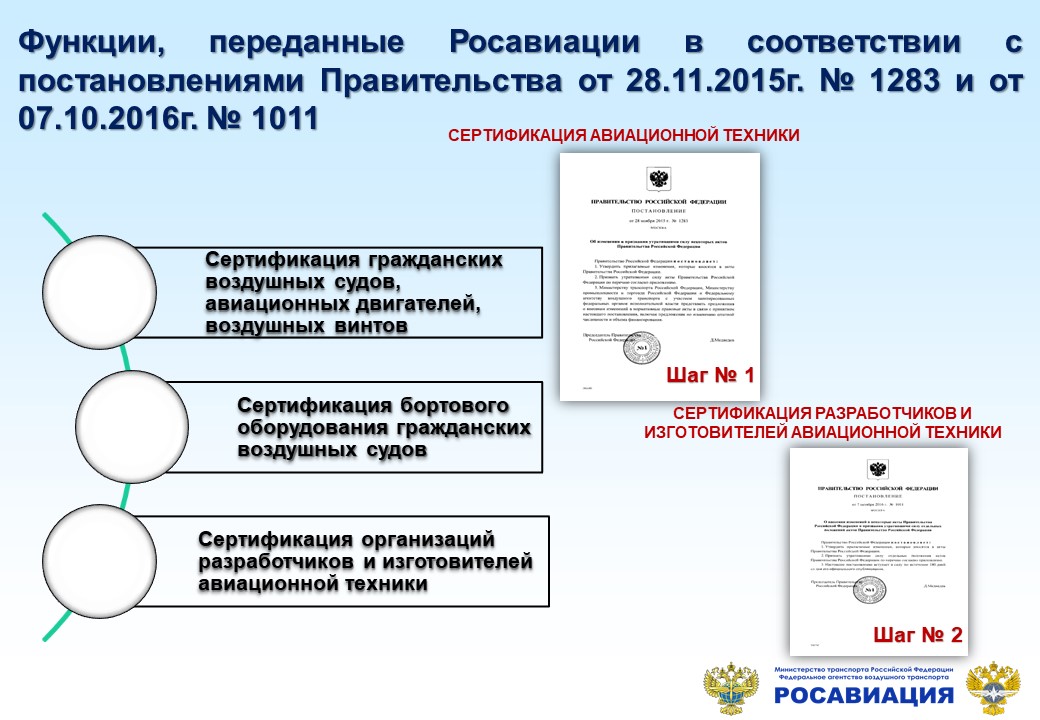 2) и проведение такой обязательной сертификации (здесь уполномоченным органом должна являться Росавиация, которой постановлением Правительства Российской Федерации № 1283 от 28 ноября 2015 года переданы функции по сертификации авиационной техники).