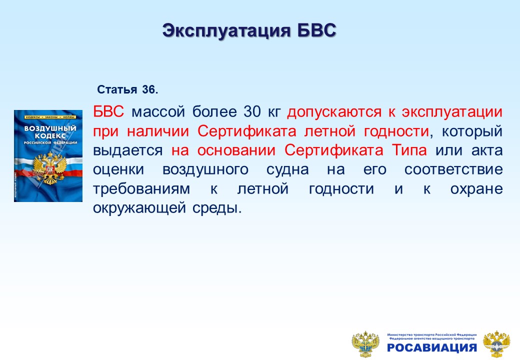 В соответствии со статьей 36 Воздушного кодекса Российской Федерации БВС массой более 30 кг допускаются к эксплуатации при наличии Сертификата летной годности, который выдается на основании сертификата типа или акта оценки воздушного судна на его соответствие требованиям к летной годности и к охране окружающей среды. Форма сертификата летной годности, выдаваемого на воздушное судно, и порядок его оформления устанавливаются федеральными авиационными правилами.