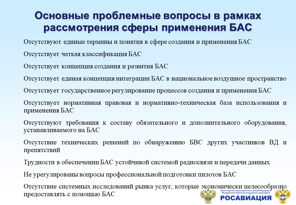 Считаем, что скорейшее устранение законодательных пробелов в части регулирования БАС окажет поддержку развитию данной отрасли экономики в Российской Федерации. И здесь необходимо обеспечить тесное взаимодействие, компетентную экспертную помощь от всех заинтересованных сторон для скорейшего решения Министерством транспорта задач по нормативно-правовому регулированию деятельности в области БАС.