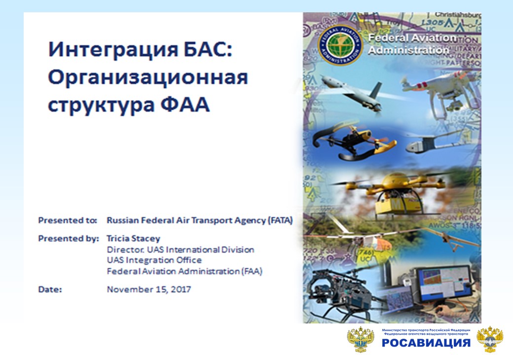 Так в период с 15 по 16 ноября 2017 года проведена встреча делегаций Росавиации и Федеральной авиационной администрации США по вопросу регулирования использования беспилотных воздушных судов(беспилотных авиационных систем).
