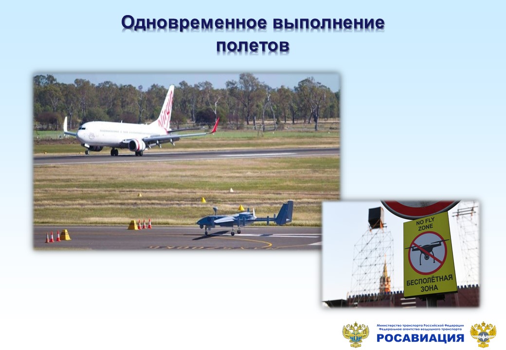 В настоящее время воздушное законодательство Российской Федерации позволяет выполнять одновременные полеты пилотируемых и беспилотных воздушных судов, но только в специально выделенном воздушном пространстве.