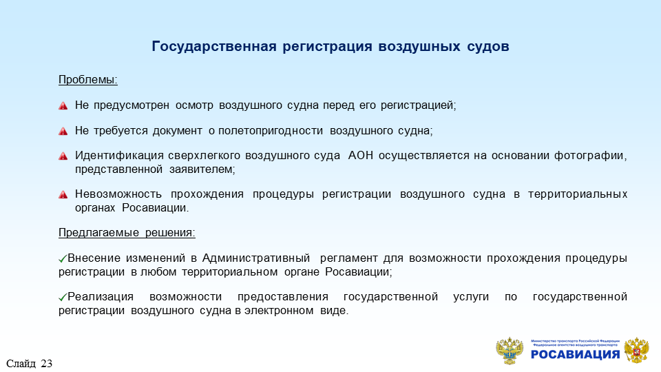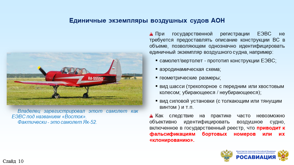 Большое разнообразие парка воздушных судов АОН, по мнению Росавиации, связано с отсутствием однозначных и понятных процедур отнесения воздушных судов к категории единичных экземпляров. Например, имеются воздушные суда отечественного производства, которые выпускались серийно, аттестата о годности к полетам не имеют. Парк этих самолетов, ранее эксплуатировавшихся в ДОССАФ СССР, достаточно большой. Поэтому требуется разработка процедур и правил, определяющих возможность и условия их дальнейшей эксплуатации.