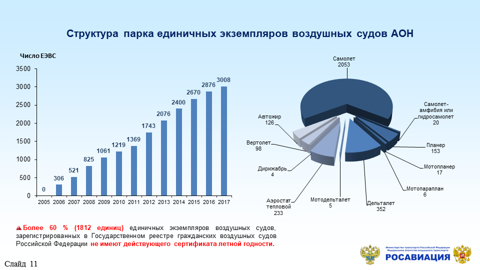 По состоянию на 1 января 2018 года срок действия сертификата летной годности истек у 630 ЕЭВС АОН (21 % от общего числа ЕЭВС). На 1182 ЕЭВС (39 %), зарегистрированных в Государственном реестре гражданских воздушных судов Российской Федерации и изготовленных до 1 января 2018 года, сертификат летной годности вообще не оформлялся. Таким образом, на данный момент времени в эксплуатации находится более 1800 ЕЭВС, не имеющих сертификата летной годности, что составляет 60 %.
